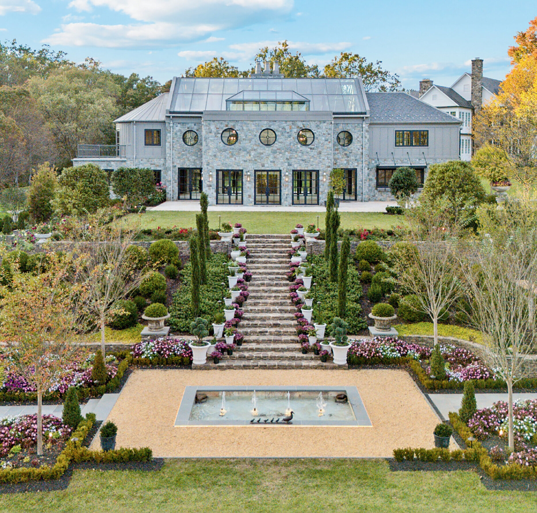 A 10,000+ square-foot, glass roof conservatory with handcrafted stone exterior and grand ballroom interior. Parterre garden with grand staircase, custom fountain with travertine inlay, bluestone and pea gravel pathways.
