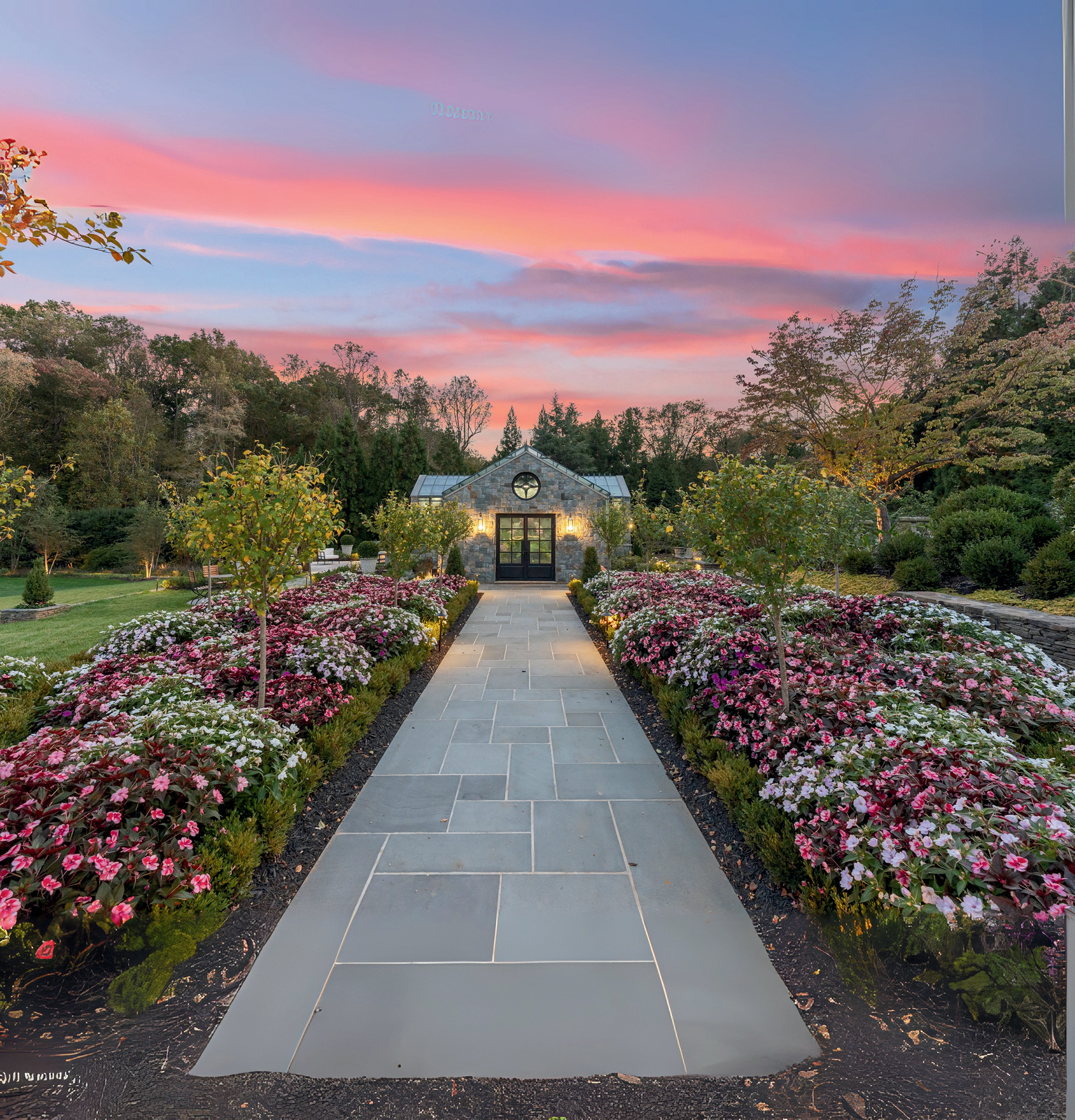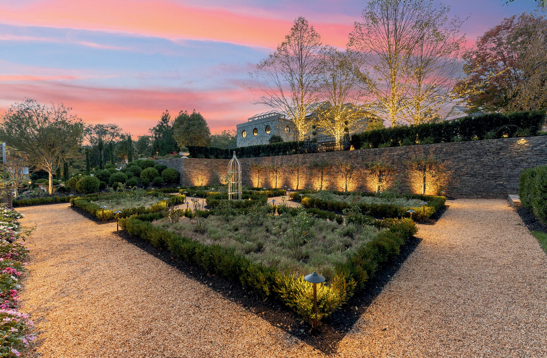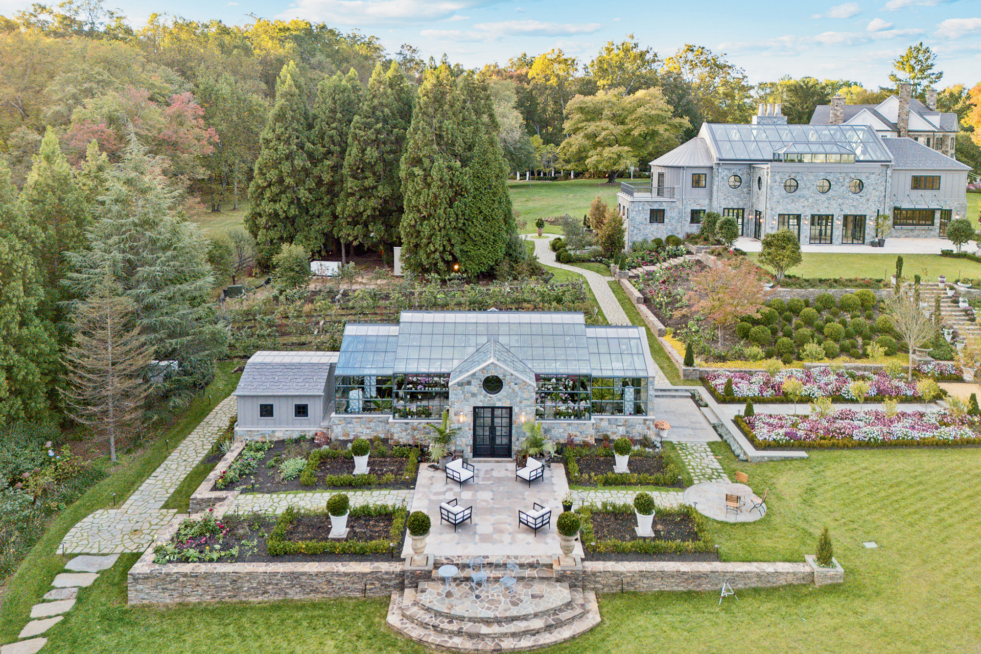 On a 10-acre pastoral estate in Great Falls, Virginia, Fine Landscapes developed a 10,000-square-foot entertainment venue for weddings and gatherings in a glass-roofed, stone conservatory-style building. Nearby, a French-inspired Parterre Garden with mature specimens, including hydrangea, crape myrtles, Italian cypress, boxwoods and seasonal flowers, leads to a fully functioning greenhouse in a matching architectural style. Garden pathways and hedges direct the eye towards the fountain and greenhouse, then back up the stone staircase to the conservatory centerpiece. From the top of the hill, the grand stone structure provides a breathtaking view of the gardens, greenhouse, the original residence and surrounding property.