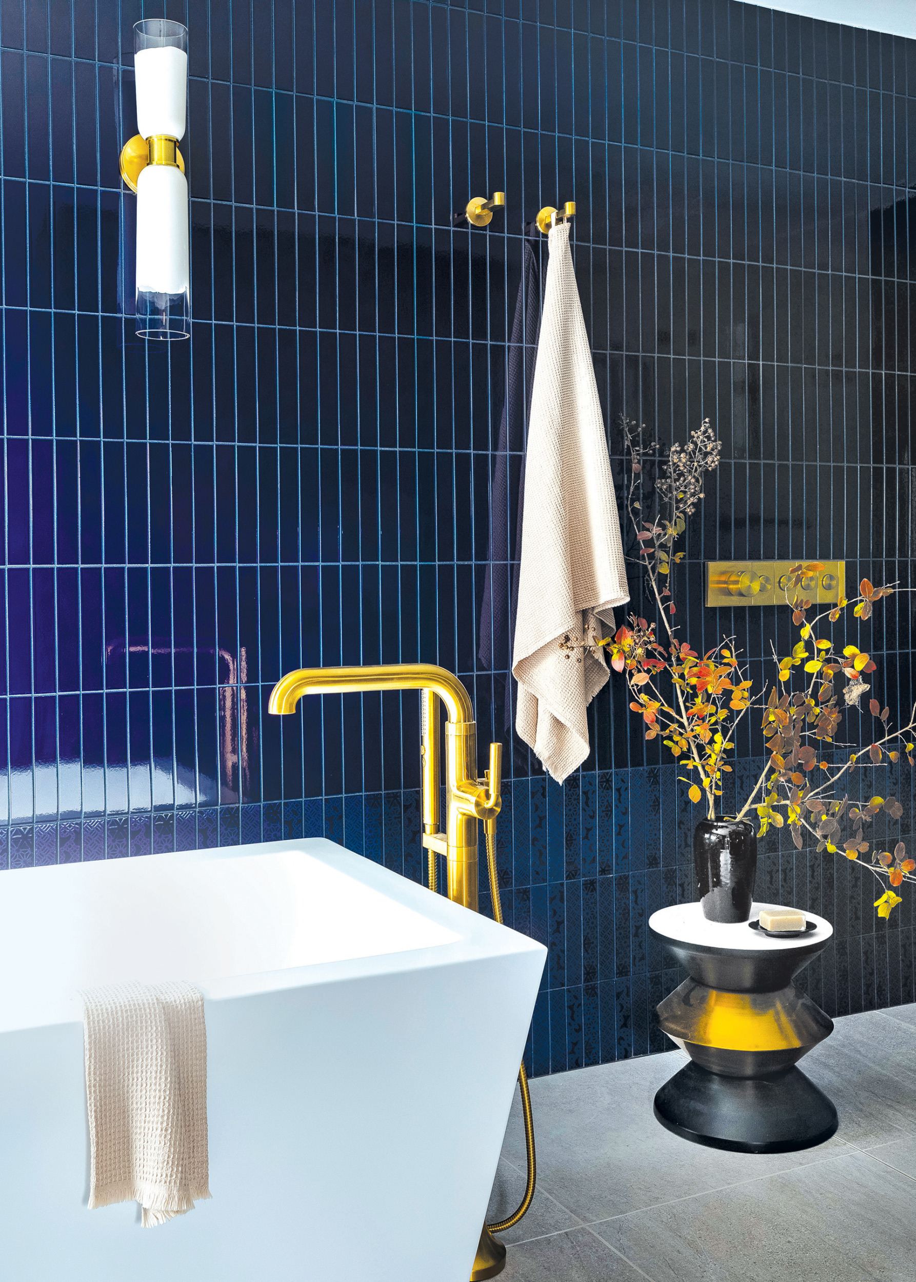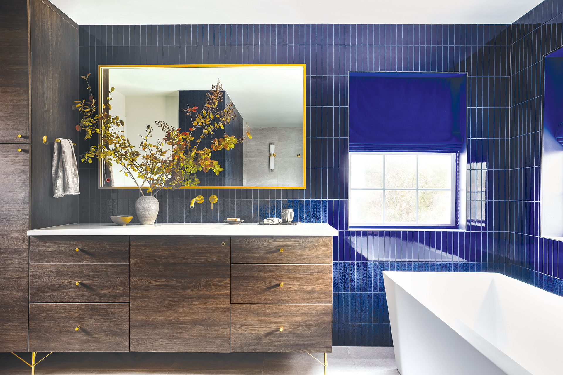 The streamlined, open plan accommodates a soaking tub, a curbless shower, a vanity and a linen closet, plus a separate WC. Glazed Japanese tile drenches the spa-like space in a saturated blue; the lower walls feature a textural mix of eight varied motifs.