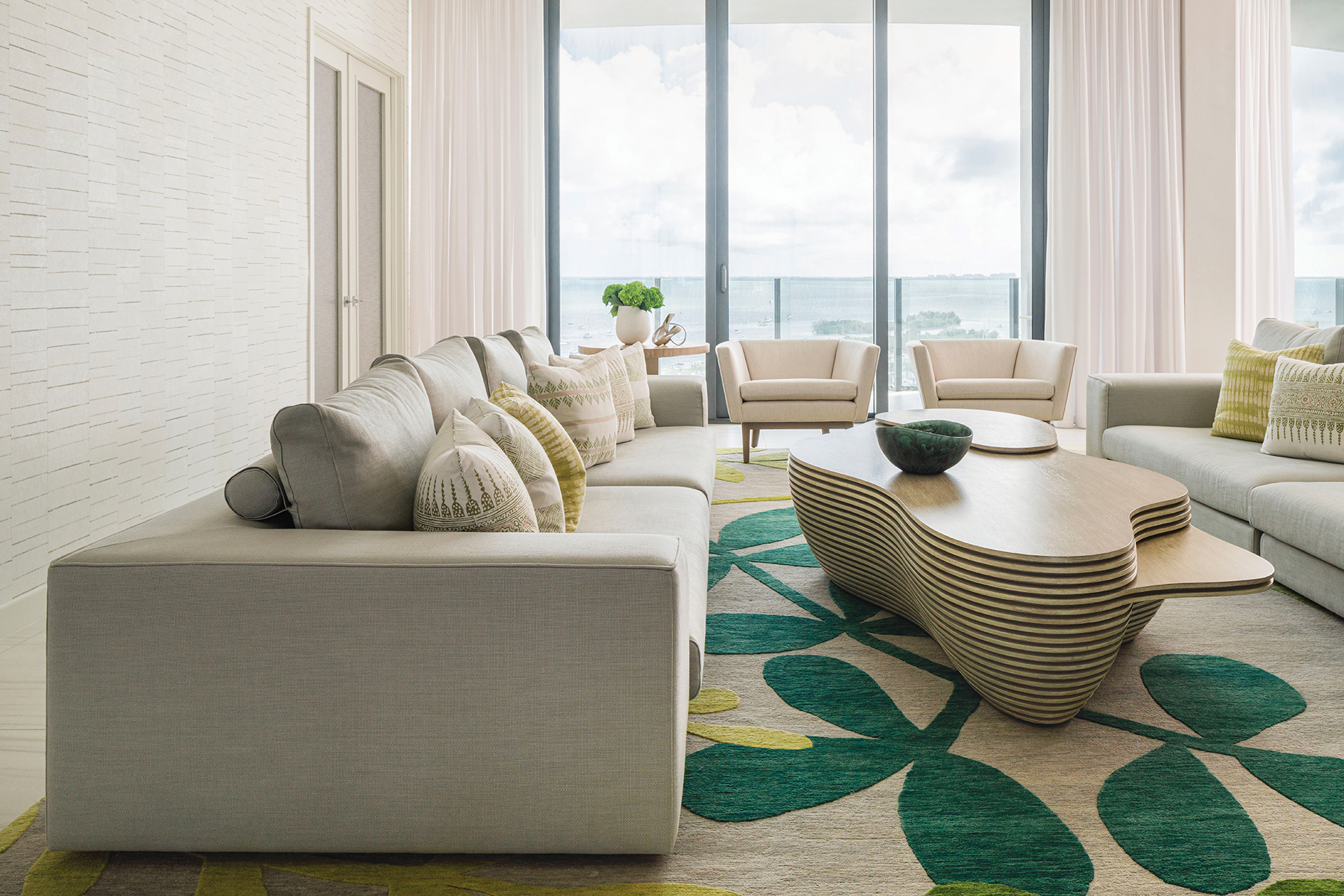 A modern, 6,200-square-foot Coconut Grove, Florida, condo presented designers Jodi Macklin and Lauren Sparber with an expansive blank slate when the owners enlisted them to transform it into a personalized, grounded getaway home. “With high ceilings and a wide-open floor plan, the condo had the potential to feel cold and impersonal,” Macklin reflects. “We needed to bring in intimacy and a sense of place, making every room feel connected yet distinct.”