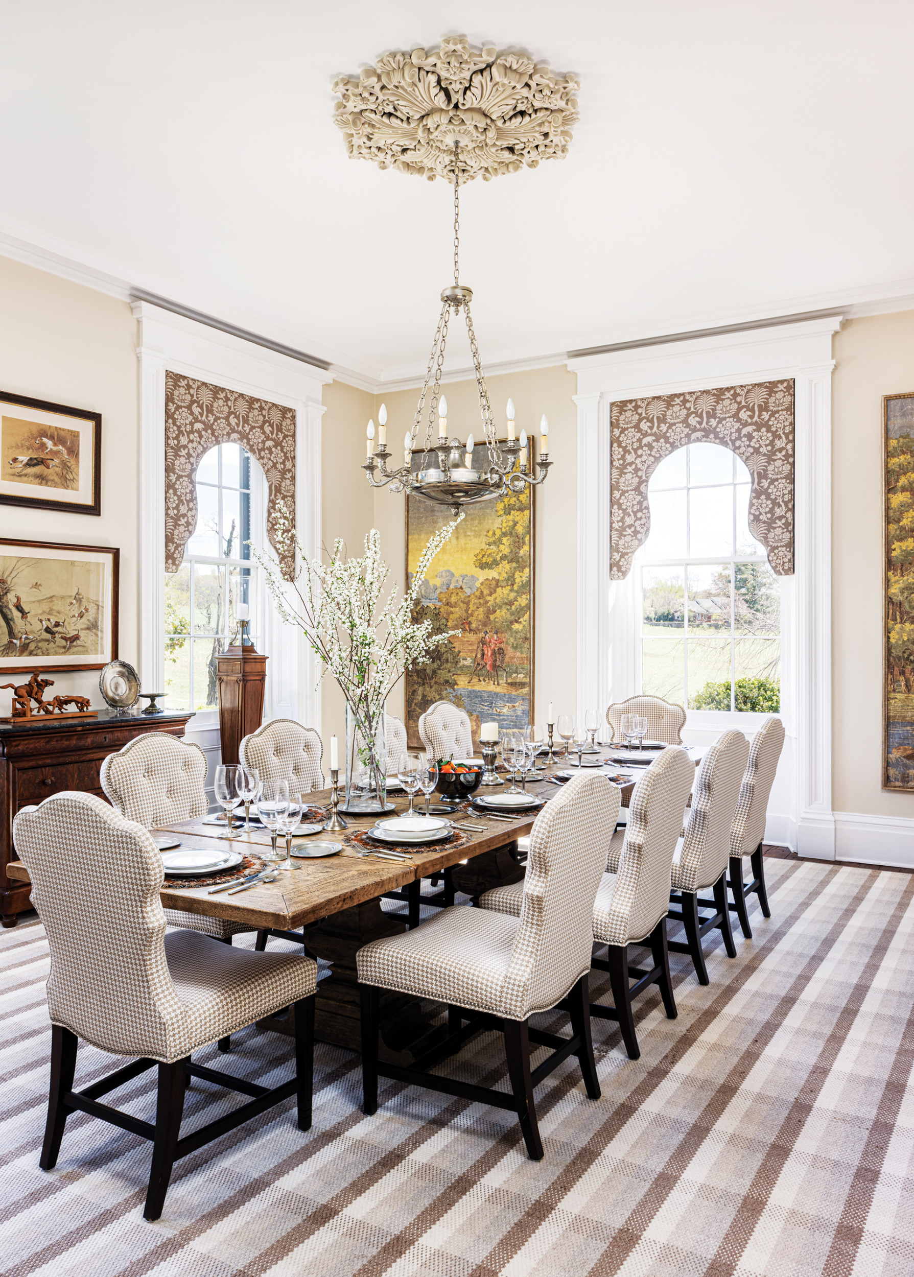 Family heirlooms bring instant character and meaning to a room,” says Jamie Merida of Jamie Merida Interiors. “The key is balance; fresh fabrics, updated finishes and layered textures help old and new work together seamlessly.” In a Middleburg dining room, his colleague Melanie Donohue enlivened cherished antiques with Schumacher window treatments and a plaid Kaleen rug. PHOTO: Stylish Productions
