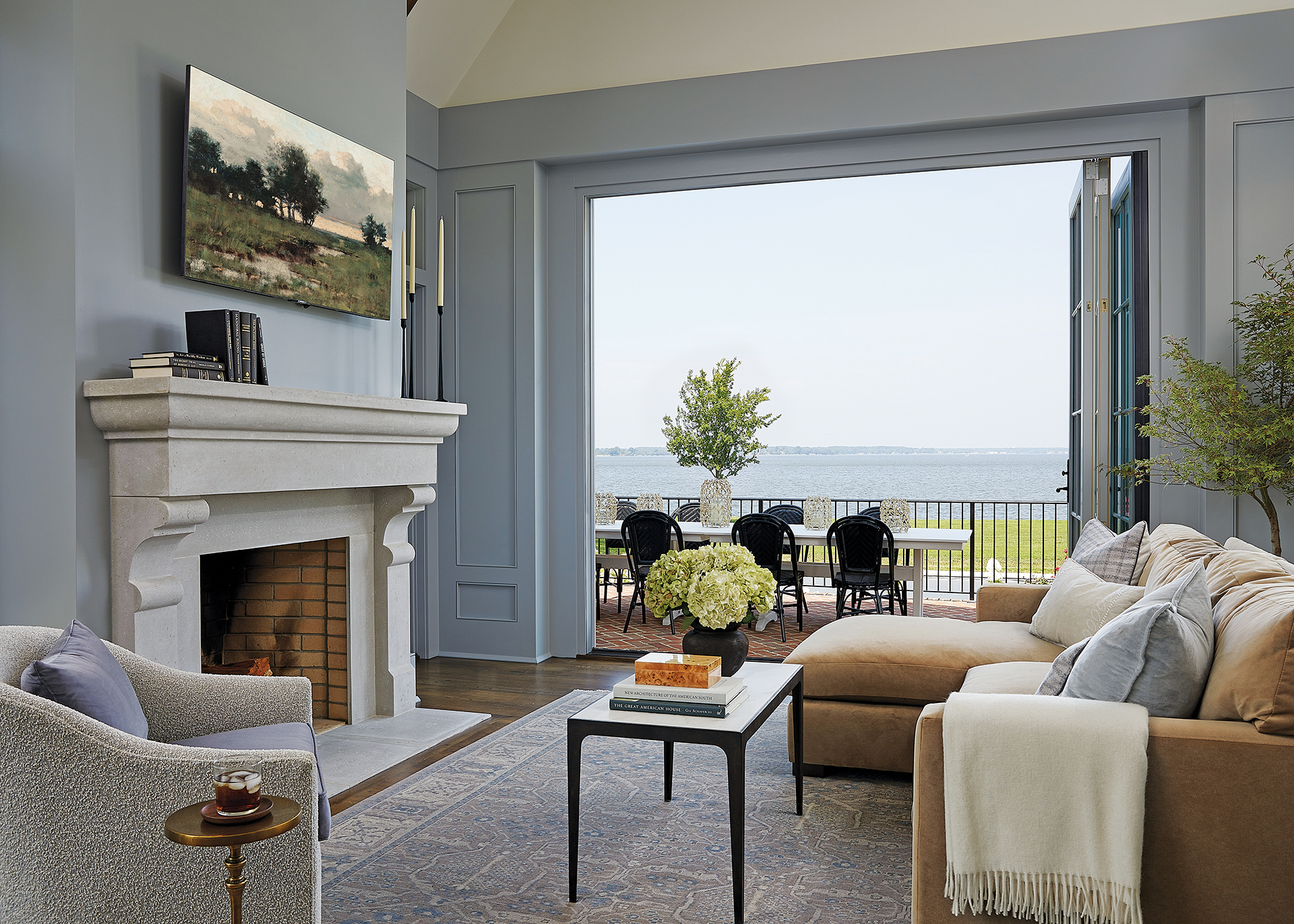 With six different points of entry to the room, the furniture layout had to be methodically plotted. A perfectly scaled custom sectional by McKinley Leather, upholstered in dog-friendly fabric, anchors the room while ensuring plenty of space to circulate; nearby French doors fold open to provide seamless flow to the dining and grilling terrace. Featuring a fireplace surrounded by an Old World-inspired mantel from Francois & Co., the room offers a snug haven year-round with views that are hard to beat.