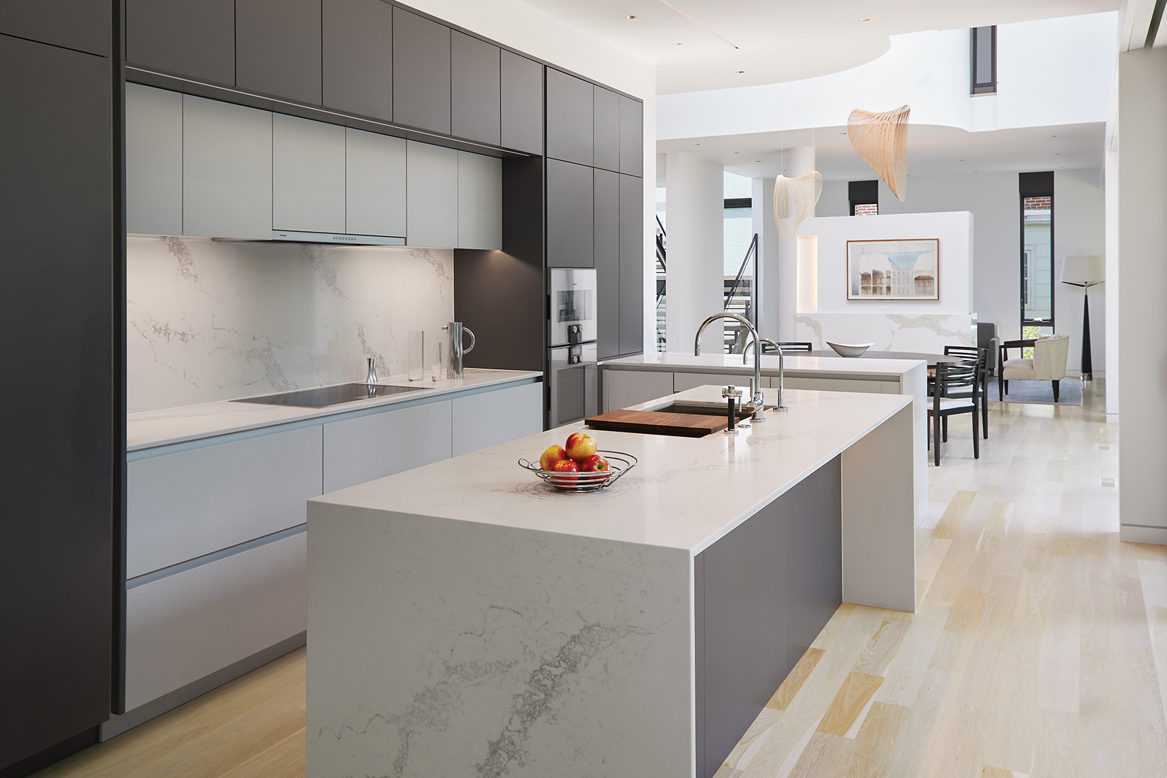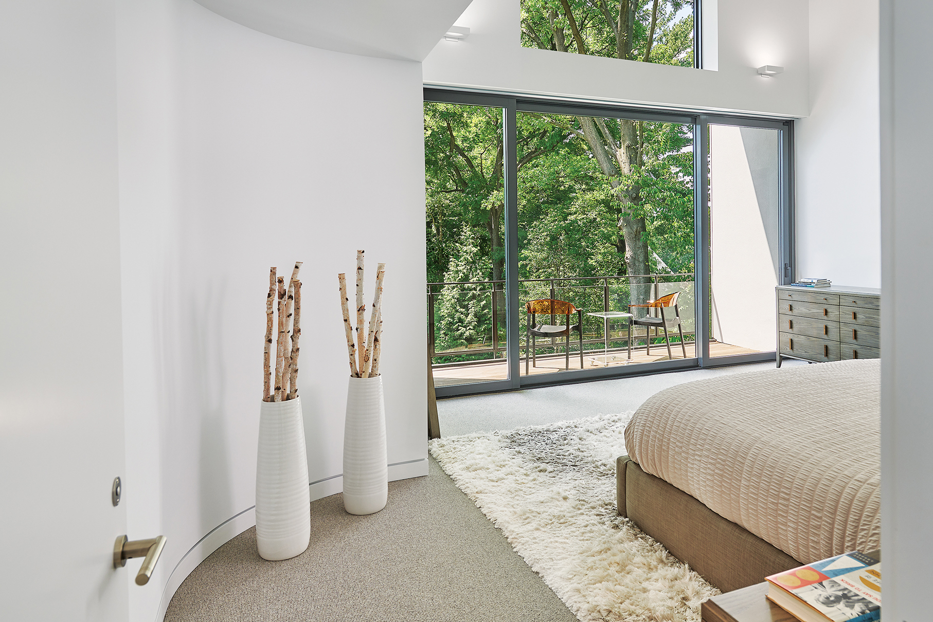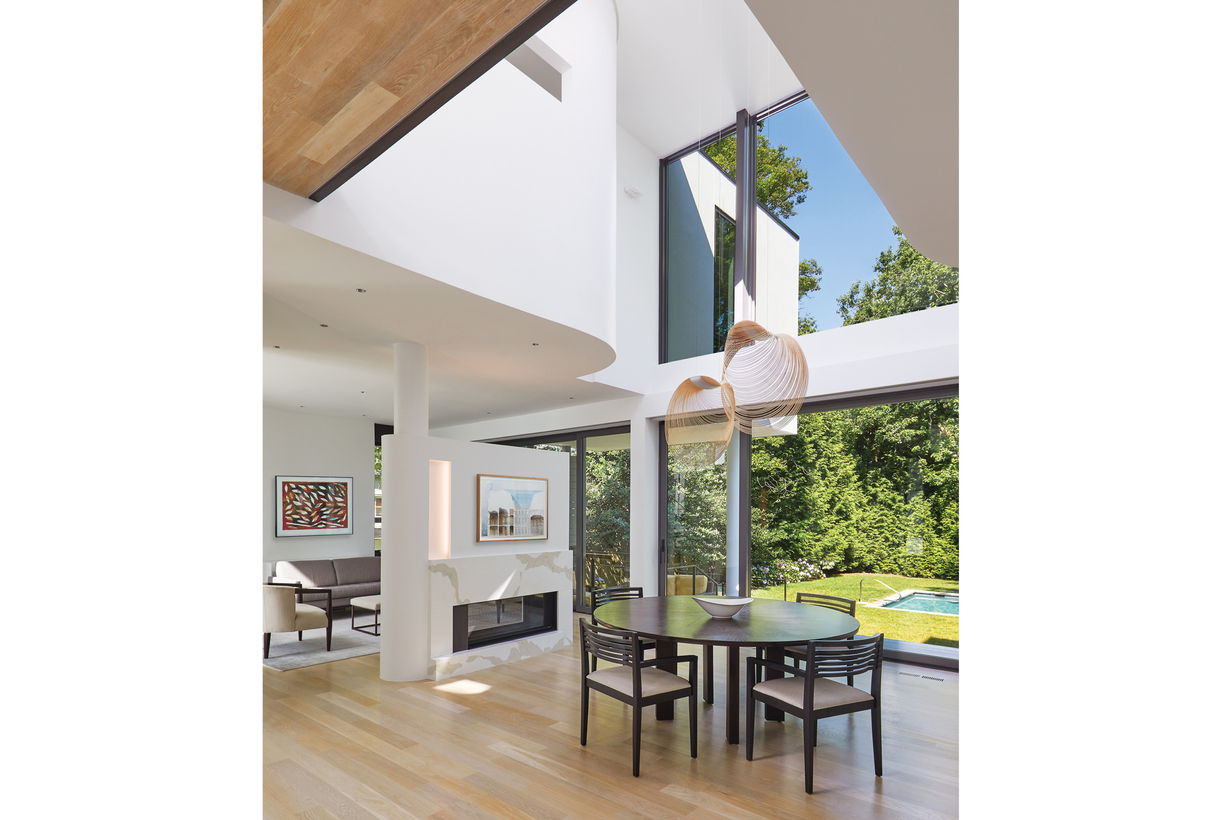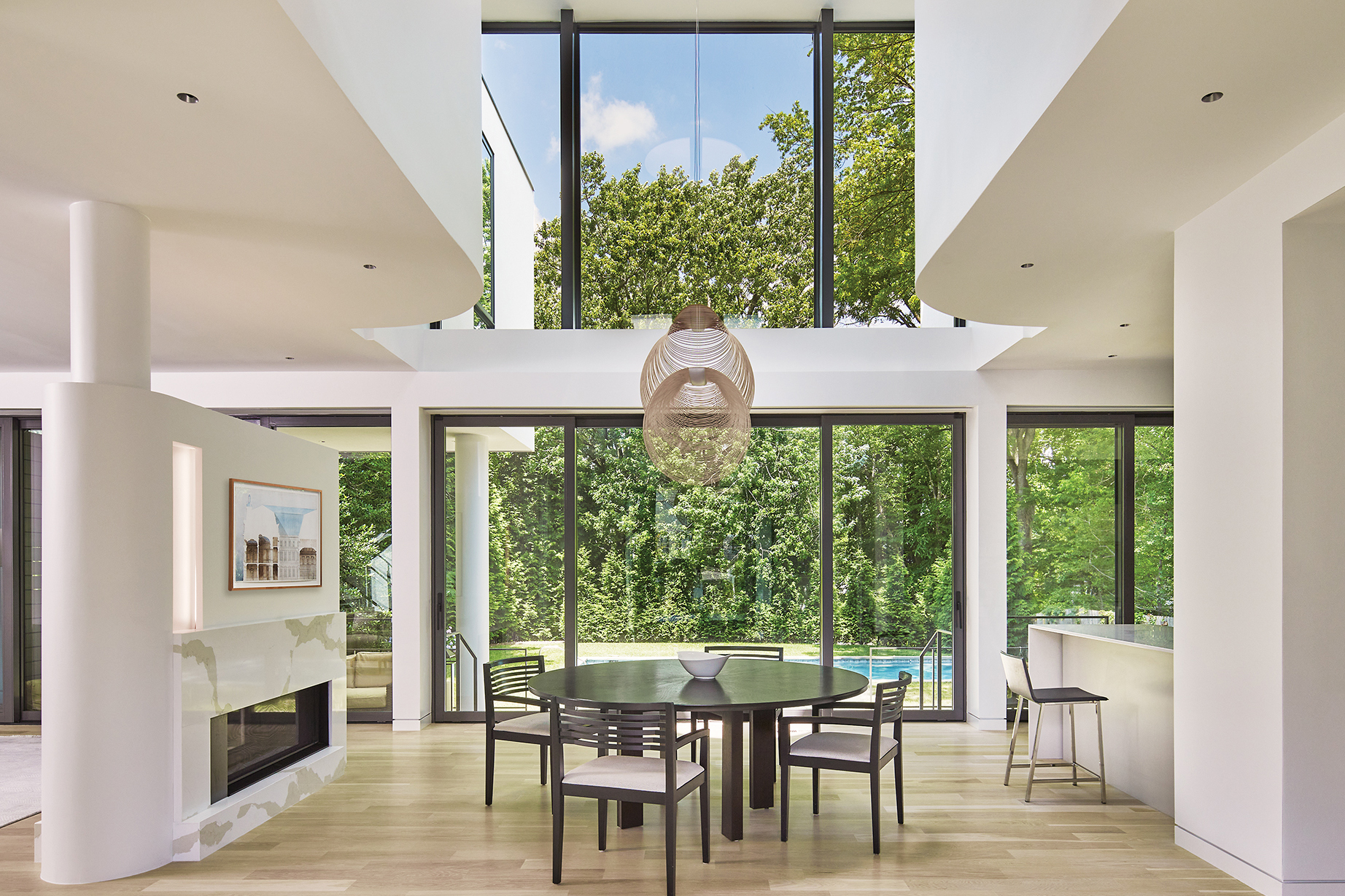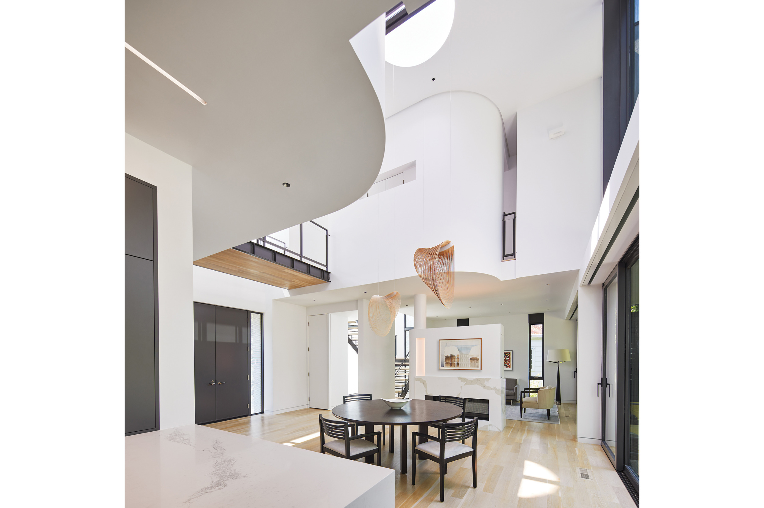 Crisp geometry and spare, simple lines define the airy interiors. In the double-height entry, a steel-and-white-oak bridge connects upper spaces sheathed in curved, white walls. “When you stand there and look outside, it’s magical, especially when it snows,” marvels the wife. Luceplan pendants made of laser-cut plywood hover like works of art above the dining area. Lower, 10-foot ceilings delineate the living room with its double-sided fireplace and the sleek kitchen and breakfast nook.