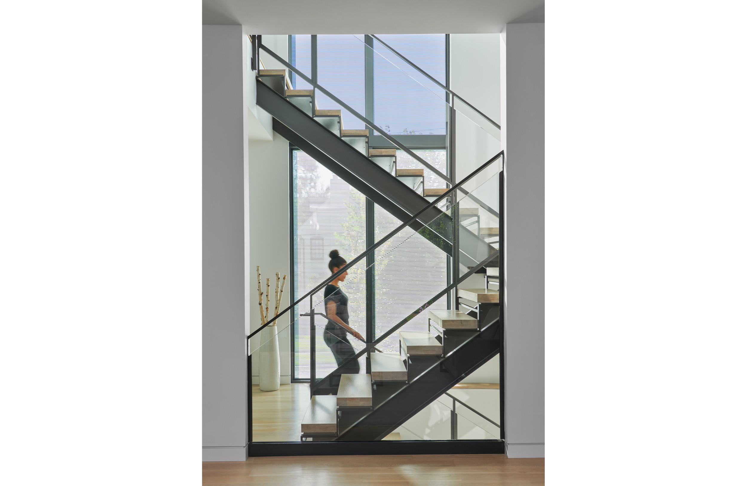 From “invisible” painted-steel closet pulls that mimic molding to electronics storage hidden in the fireplace wall, clever design moves abound. Take, for example, the floating, steel-and-white-oak staircase enclosed in glass. Illuminated by full-height windows, Mogensen’s meticulous creation exposes all of its parts, becoming a sculpture in its own right.