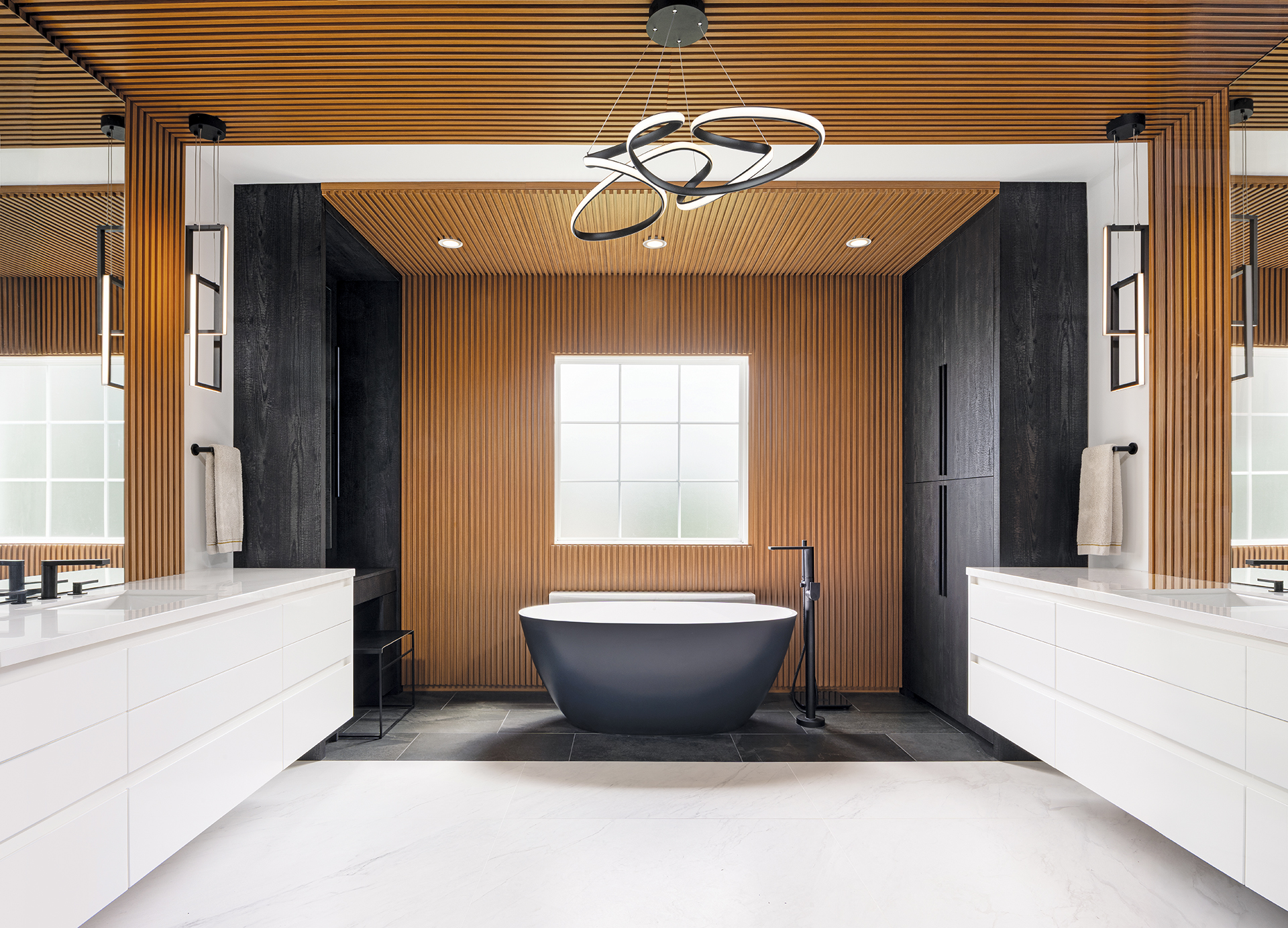 To balance the cool porcelain and warm up the palette, Gilmer introduced teak wood slats. These create a feature wall at the tub but continue across the ceiling and line the walls throughout the vanity area. “This choice created a nice balance and completed the composition,” she notes.