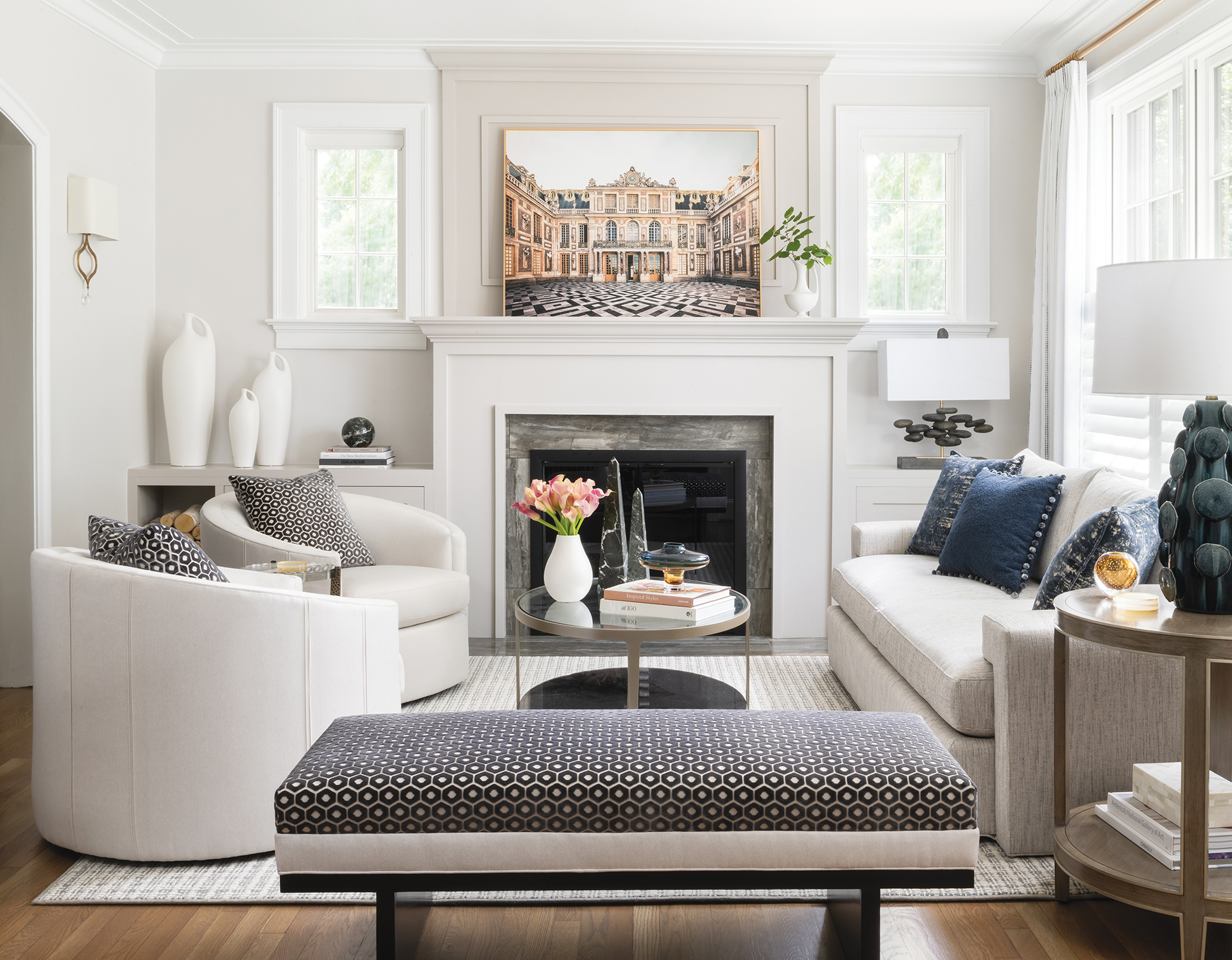 The light and airy living room gathers guests on a Vanguard sofa, Caracole chairs and a Fabricut bench topped in Architex cut velvet. The coffee table is from Charleston Forge.