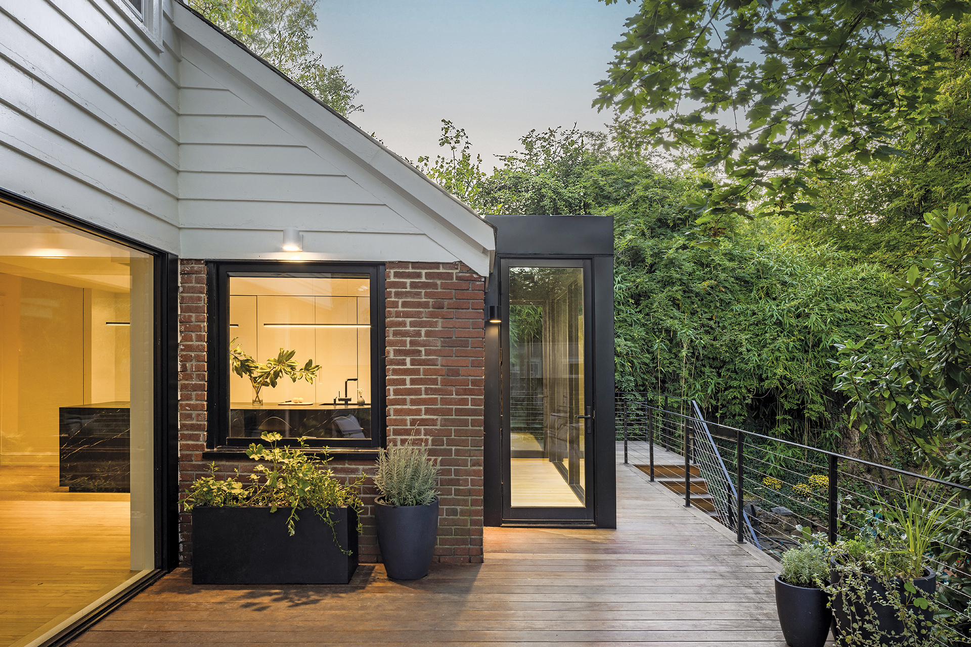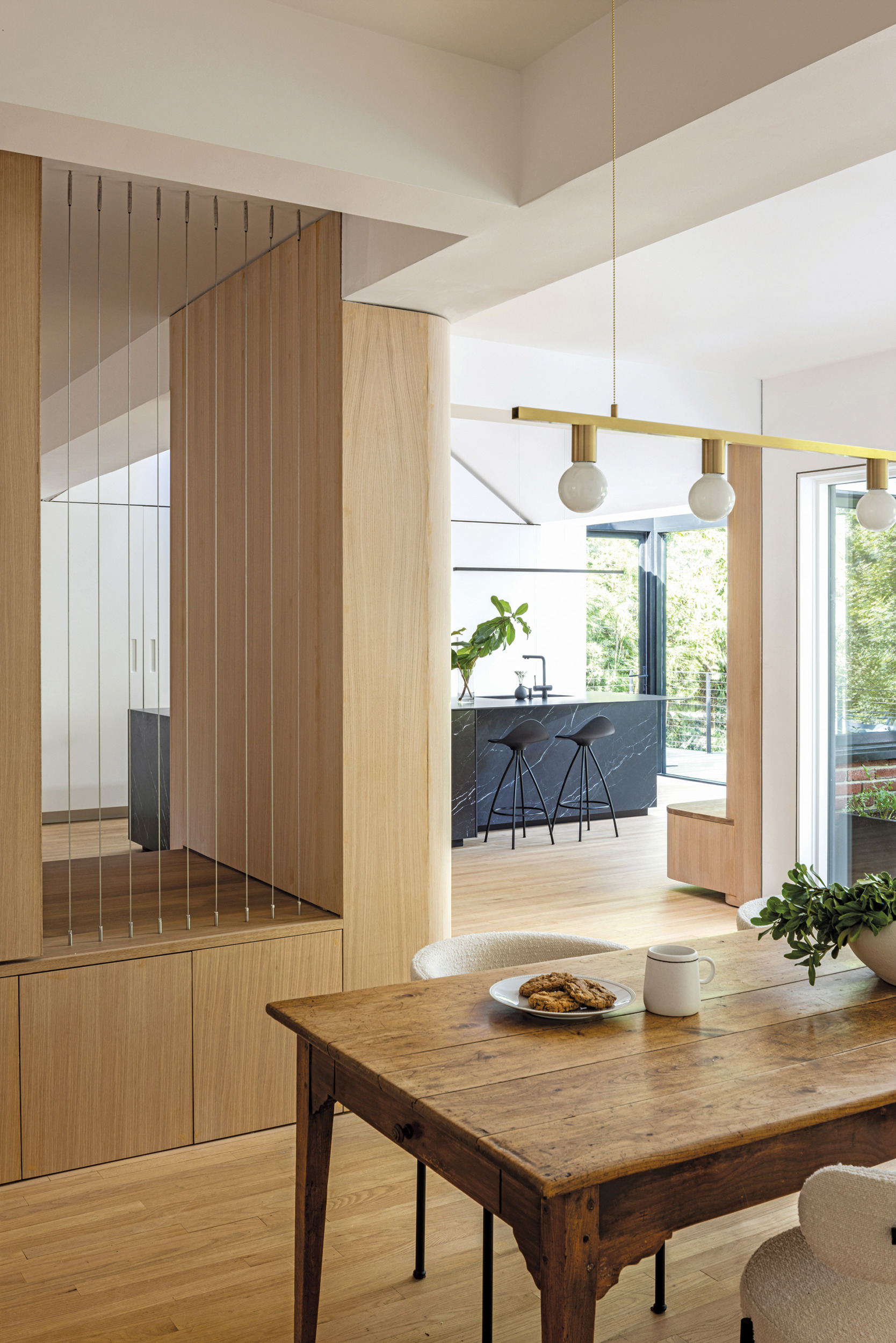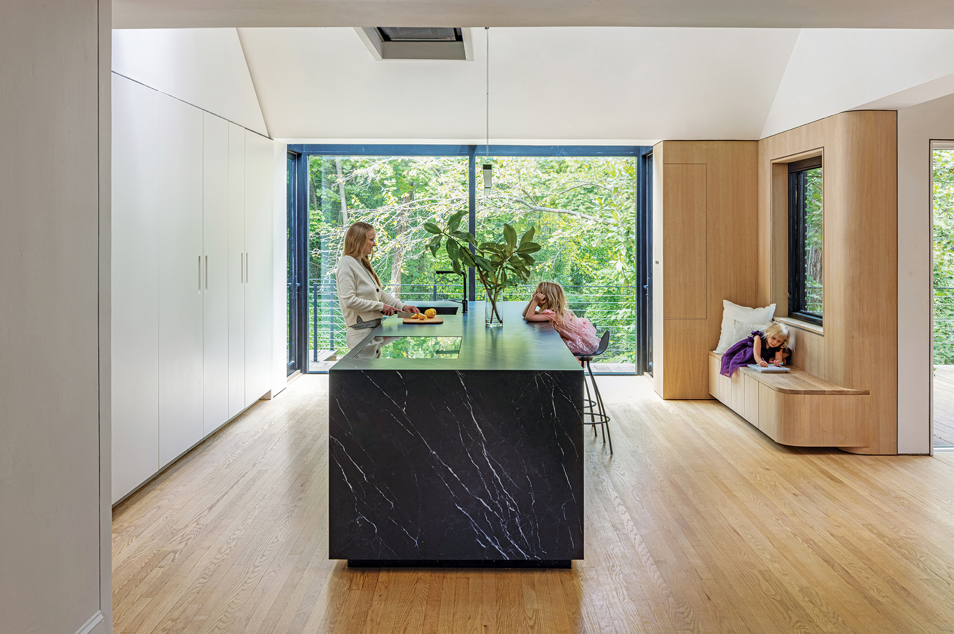The owners of this Cleveland Park center hall Colonial, architect Megan Downey and her journalist husband, found that its best asset—an expansive backyard that looks onto a ravine—was unfortunately blocked by a rear attached garage. “It’s an amazing forested wonderland with a creek, but you wouldn’t have known it from the way the house was laid out,” she explains. Desiring a family-friendly kitchen that felt connected to nature and to the rest of the house so they could keep an eye on their two young daughters, Downey devised a plan to eliminate the wall between the abode and the garage and relocate the kitchen to the former garage on the home’s posterior.