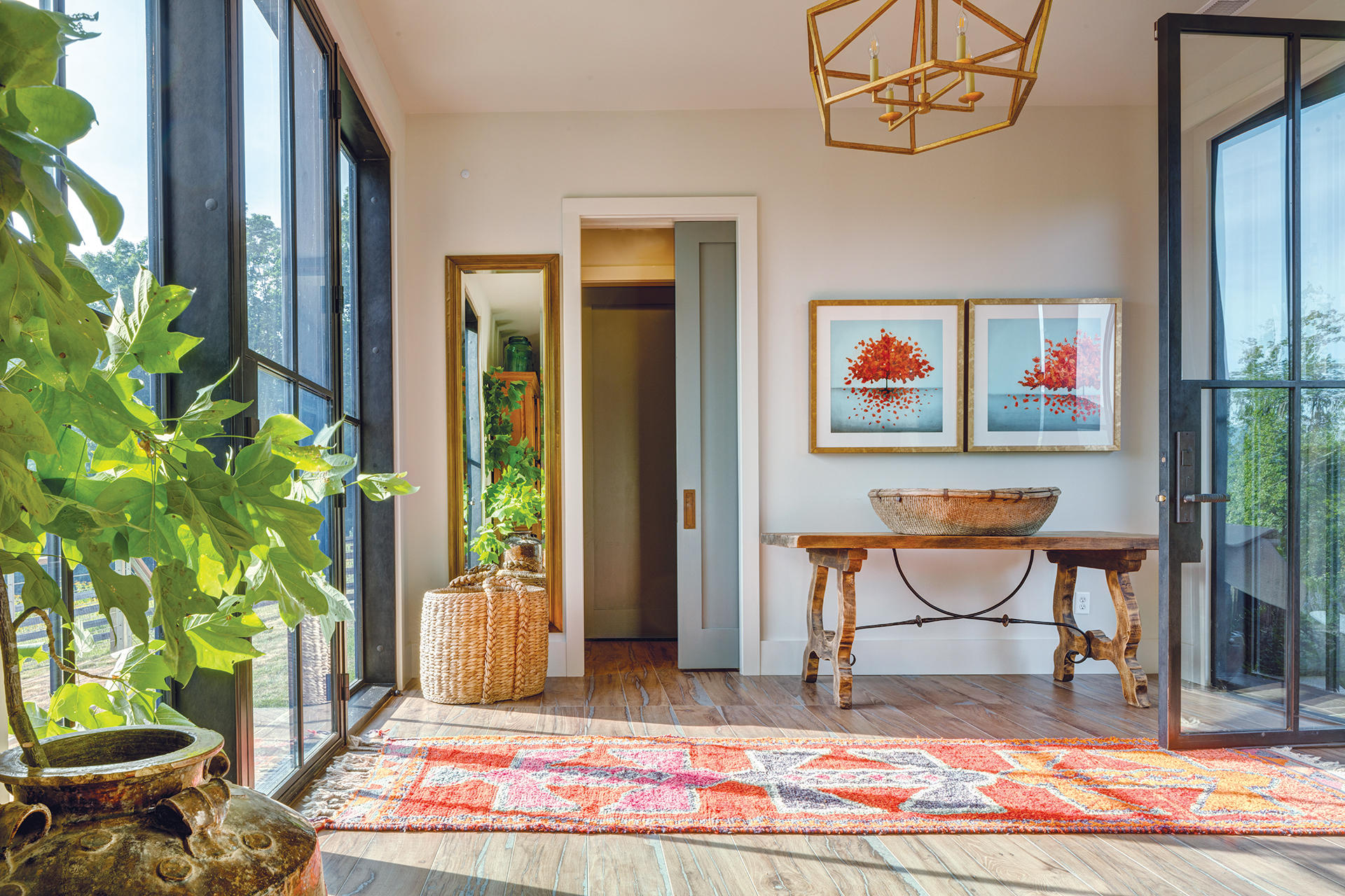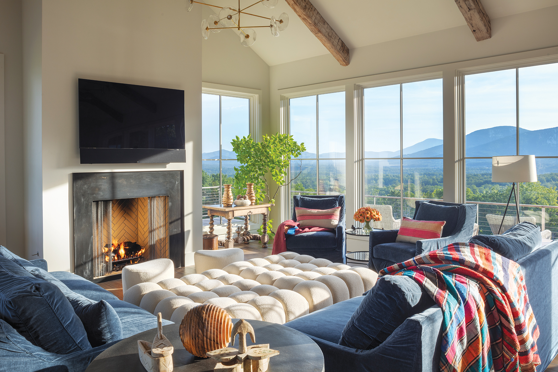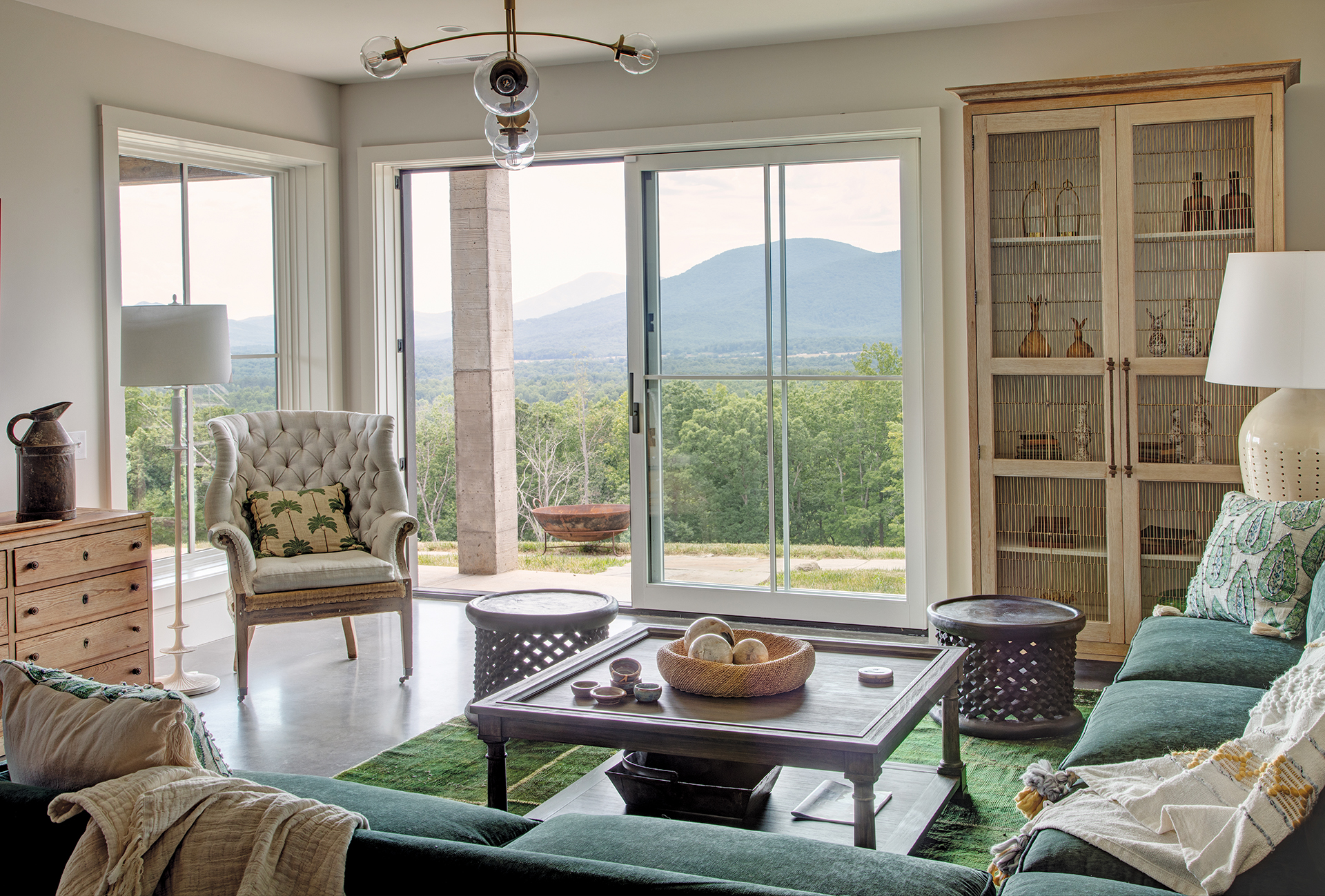 She teamed with longtime collaborator Doug Croker of ILEX Construction on the project. The first order of business: siting the house on its hilltop perch. “It required some vision to picture what kind of views it could have,” Purple Cherry recounts. “I wanted a 195-degree view from everyday rooms where we’d spend the most time.” To make that panorama possible, she cleared eight acres and situated the house perpendicular to the south-facing hills, conceiving a glassy great room at one end. From there, she explains, “We can see the sun rise above the mountain range to the east, then it travels all the way around and we can see it set on the western side.”