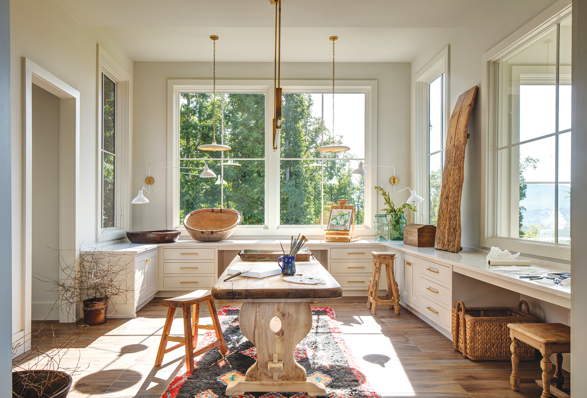 Cabinetry Hardware: anthropologie.com. Center Worktable: Antique through schwung.design. Ceiling Pendants & Wall Sconces: visualcomfort.com.