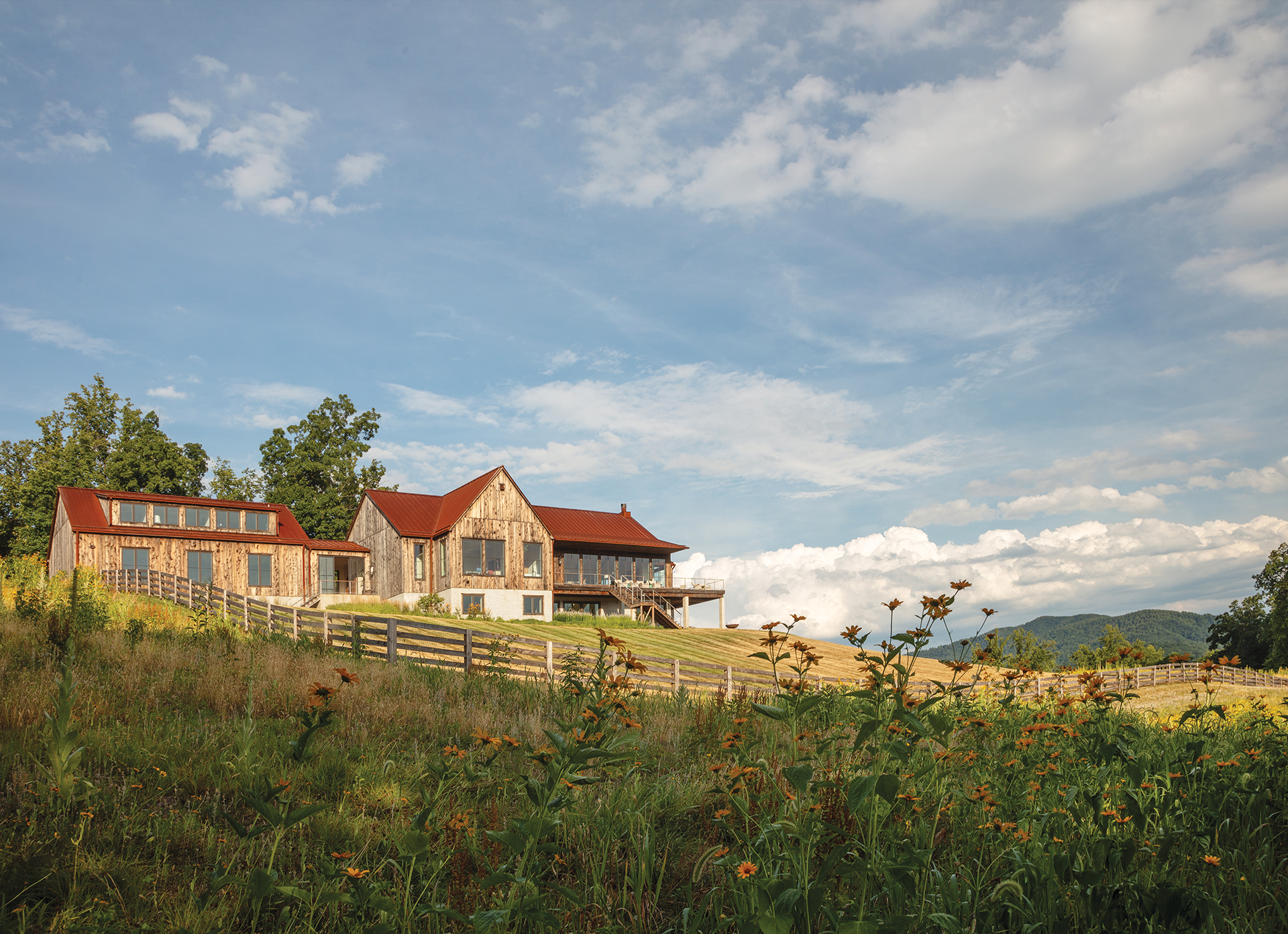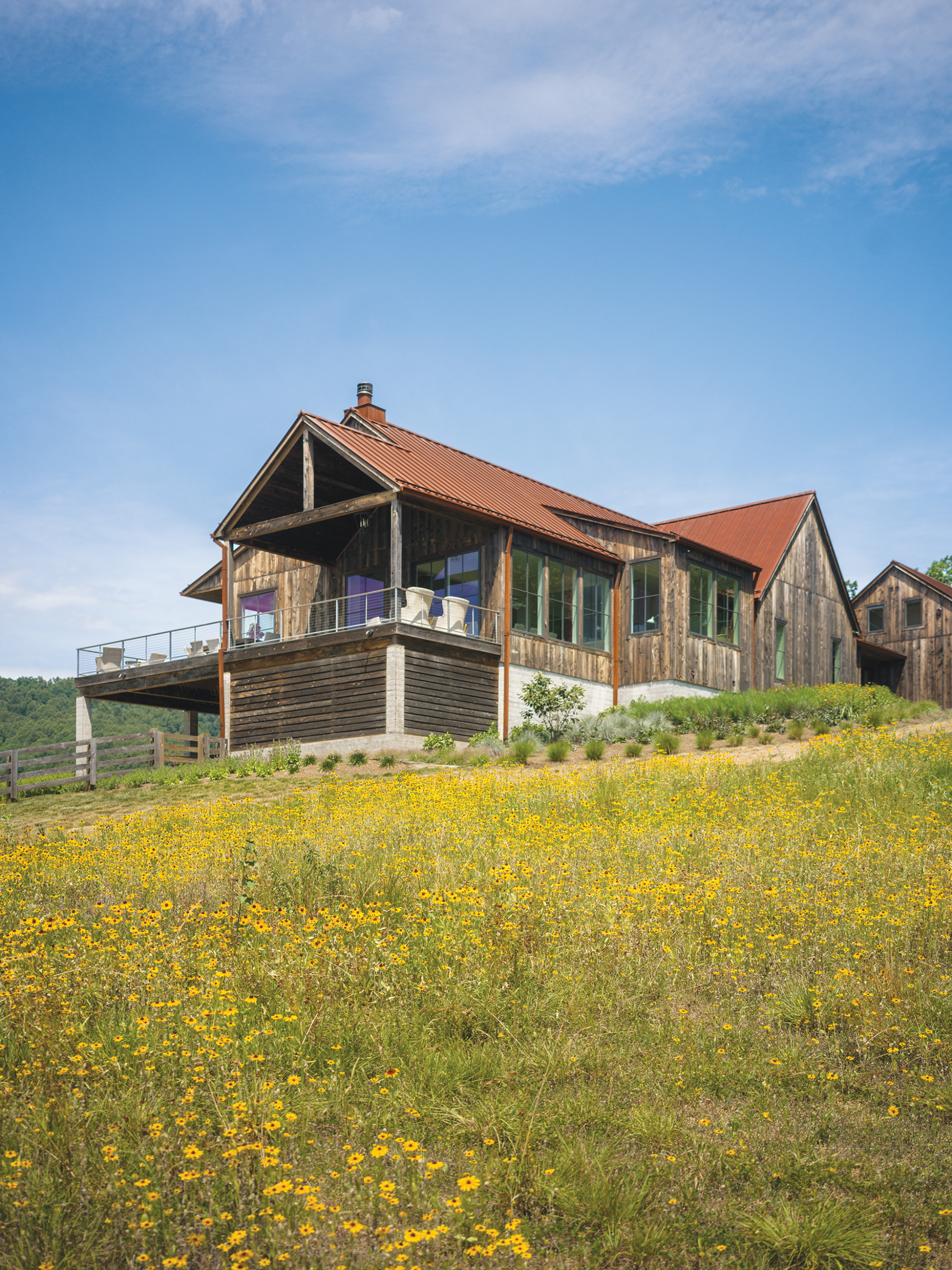 While the property remains mostly untamed, Campion Hruby Landscape Architects surrounded the residence with greenery and planted a field of wildflowers that unfurls beyond a fenced expanse where the dogs run free.