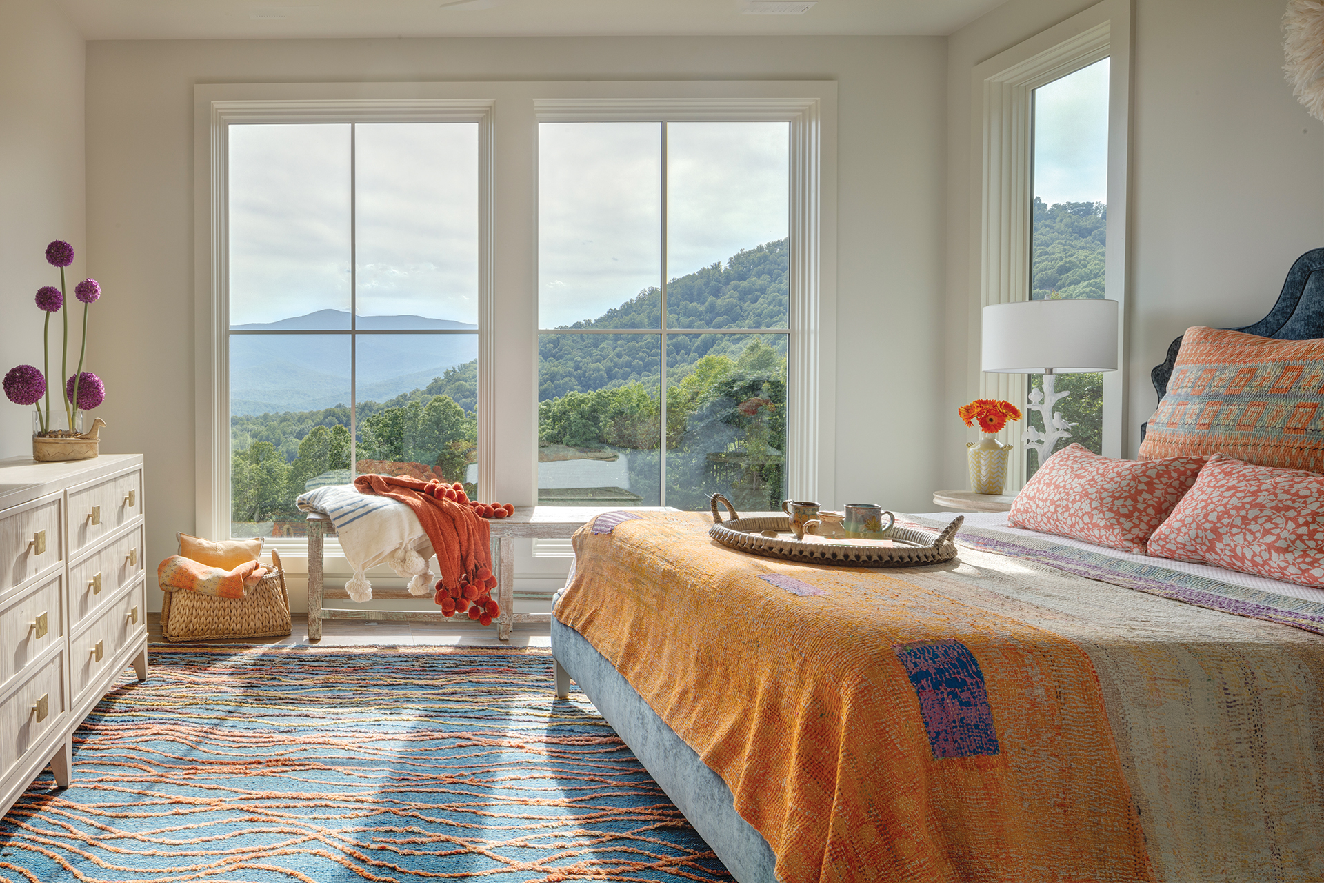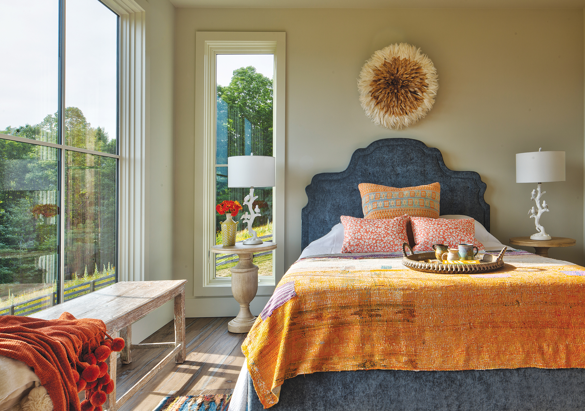 Bed & Bed Fabric: Custom through themtcompany.com. Juju Hat over Bed: etsy.com. Side table: centuryfurniture.com. Branch Lamp: visualcomfort.com. Window Bench: madegoods.com. Orange Throw/Bedspread: vintage through alokahome.com. Bed Pillows: vintage through alokahome.com; homegoods.com. Dresser: centuryfurniture.com.