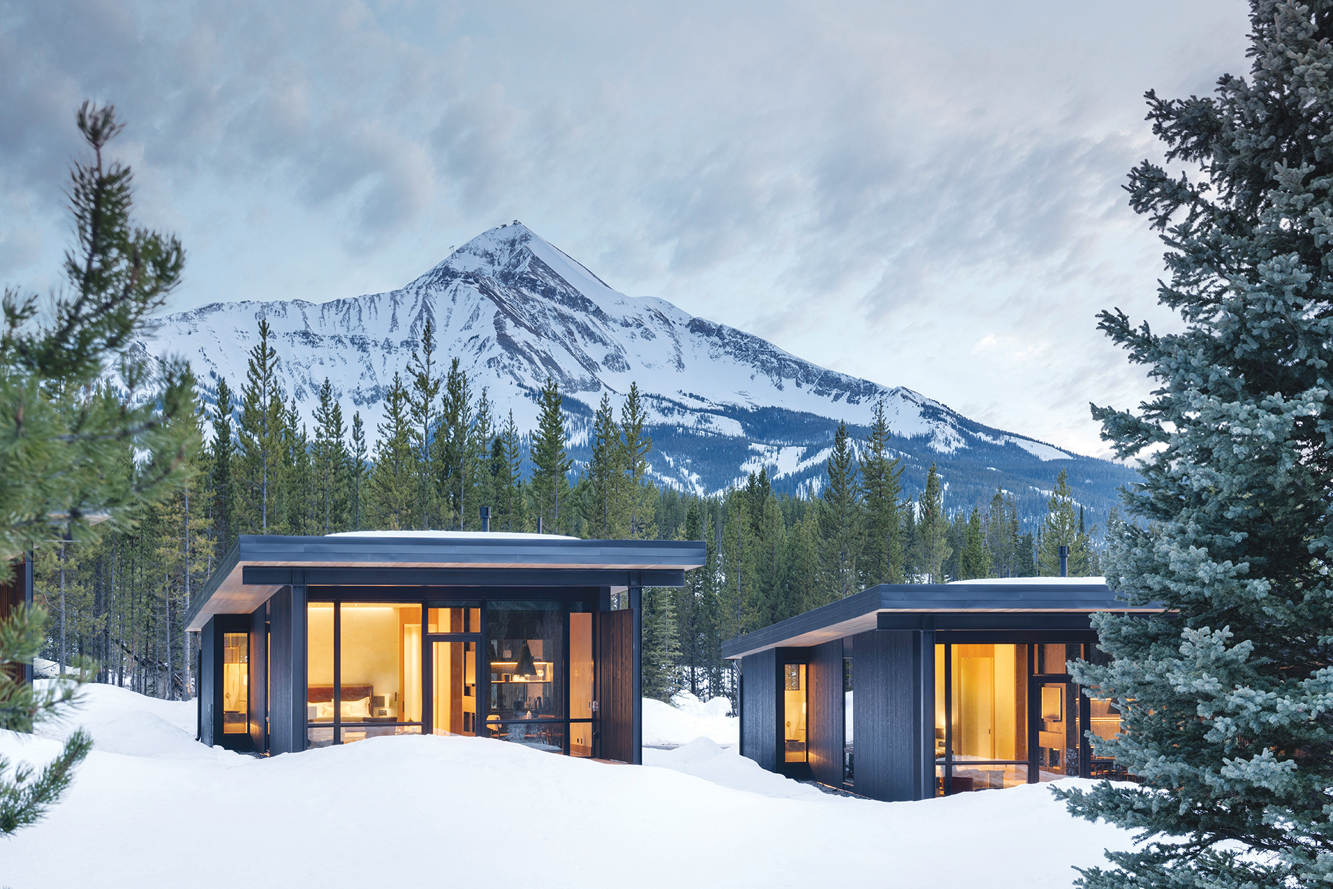 Set on 240 acres bordered by the protected lands of Montana’s Greater Yellowstone Ecosystem, One&Only Moonlight Basin is a new, year-round luxury destination for skiing, snowboarding, horseback riding and golf. Designed by Olson Kundig to complement panoramic views of Big Sky’s pristine wilderness (left), the resort offers lodging in rooms, suites, luxury cabins (top and above) or private vacation homes. Dining options include The Landing at the Sky Lodge; Akira Back, a Japanese-style grill serving steak and game; all-day fare at Wildwood café and elevated cocktails at Dear Josephine lounge. A wellness spa with indoor pool prioritizes recovery and relaxation. Rooms from $1,100. oneandonlyresorts.com
