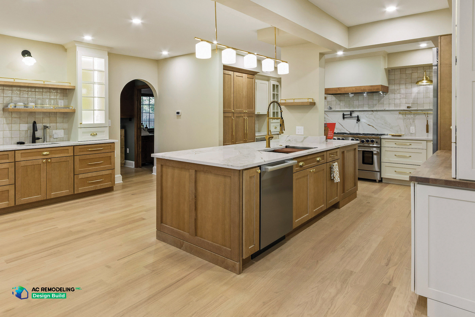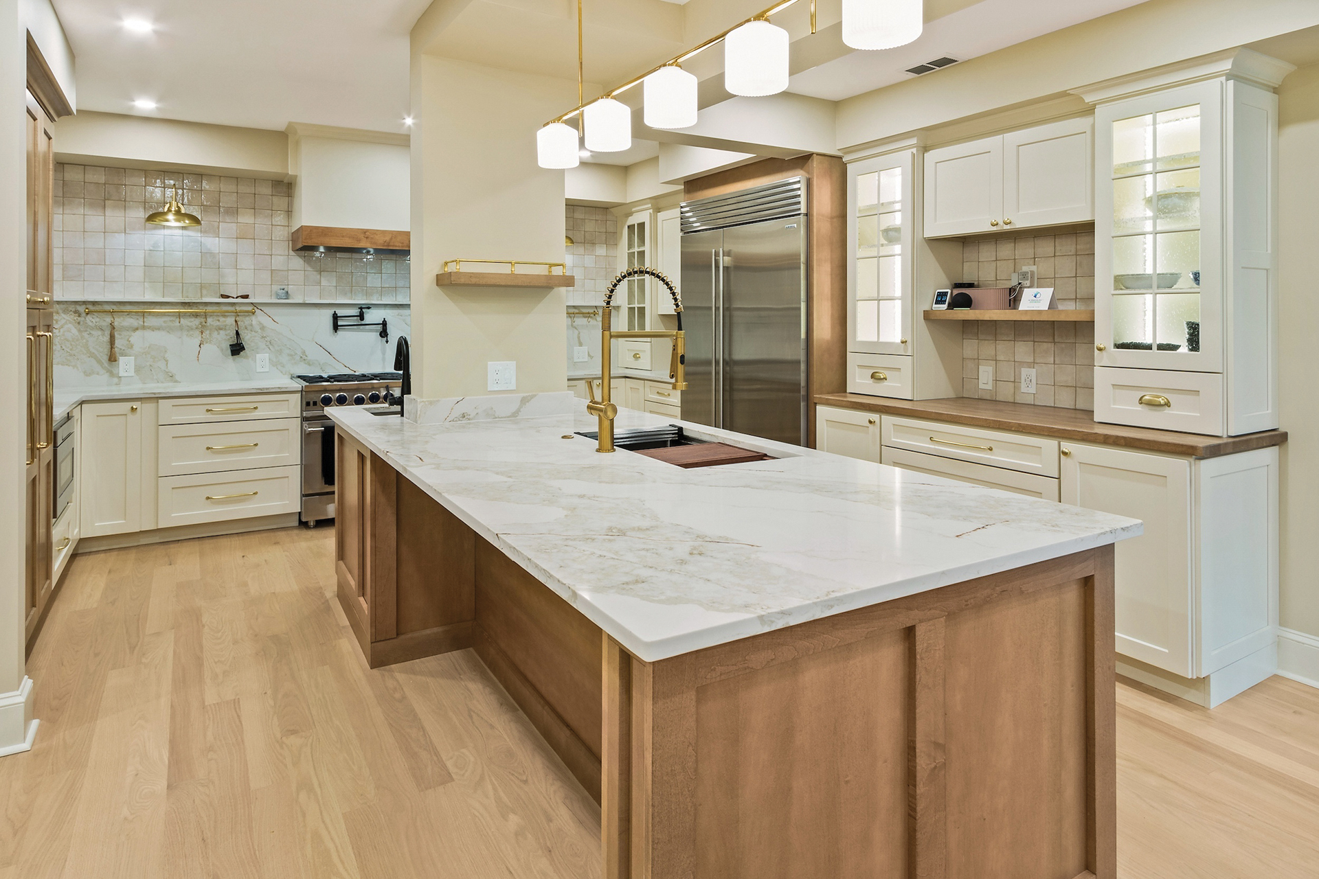 Blending transitional, modern and layered design, this inviting space achieves a timeless look by pairing classic cabinet profiles with sleek simplicity. The design is notably warm, utilizing beautiful natural wood tones alongside creamy, off-white paints that feel airy and welcoming. delivering a custom, high-end feel with enduring style.