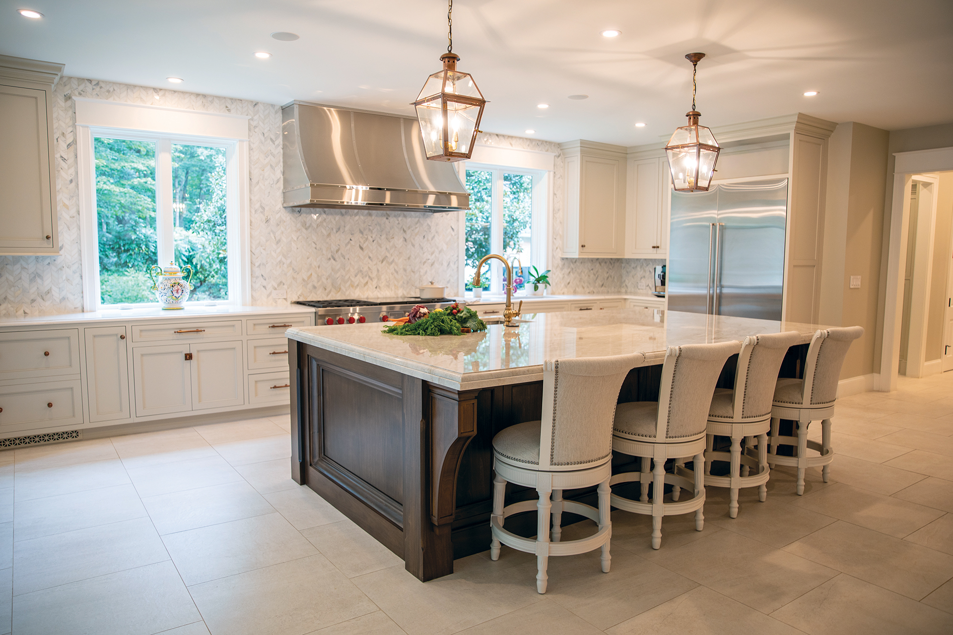 Details like natural copper lantern pendants and bronze cabinetry hardware make all the difference in the design. Durable natural Perla Venata Quartzite countertops anchor the island and are an investment, while the perimeter is a more cost-effective neutral quartz. The large-format floor tiles are a commercial-grade porcelain that has the look of pale limestone, yet offers durability at a better price point. The key to great kitchen design is to consider each component as part of the whole and determine what makes the most sense for the client.