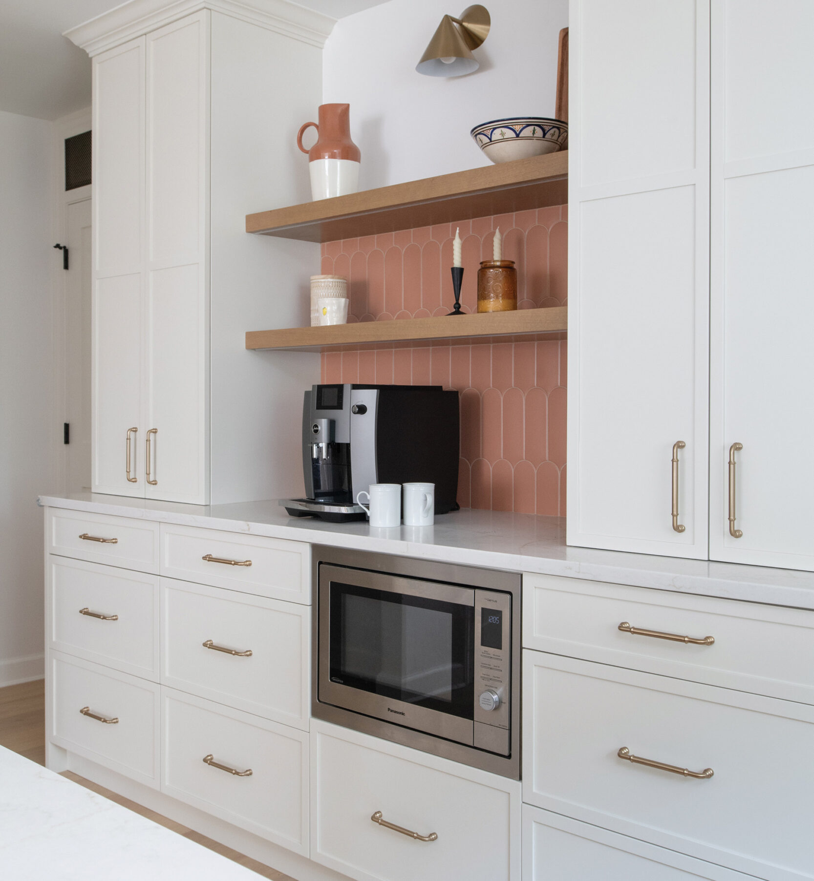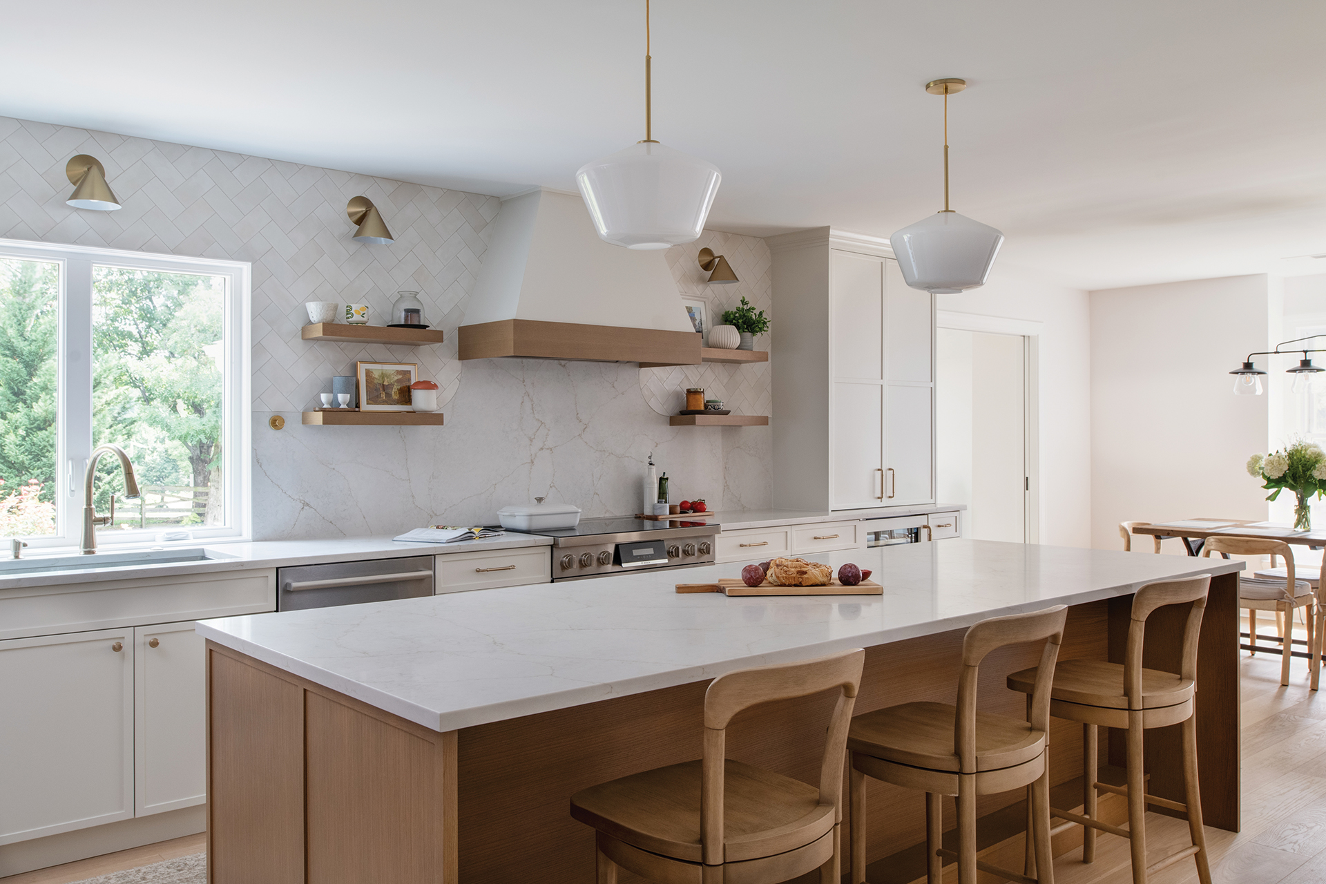 A Northern Virginia family with young children called on Denny + Gardner Design-Build to transform three separate rooms into one spacious, open-plan kitchen connected to a new family room addition built by the design firm. Incorporating a mudroom, laundry area and walk-in pantry directly off the kitchen creates a simplified, family-friendly layout perfect for everyday living. Details include terracotta ceramic tile at the coffee station and Gouache Nuage subway tile, laid in a herringbone pattern, which complements the Calacatta Valentin quartz backsplash at the stove and countertops. Removing walls between the kitchen and both the dining room and the family room opened up the space, lending a more generous flow.