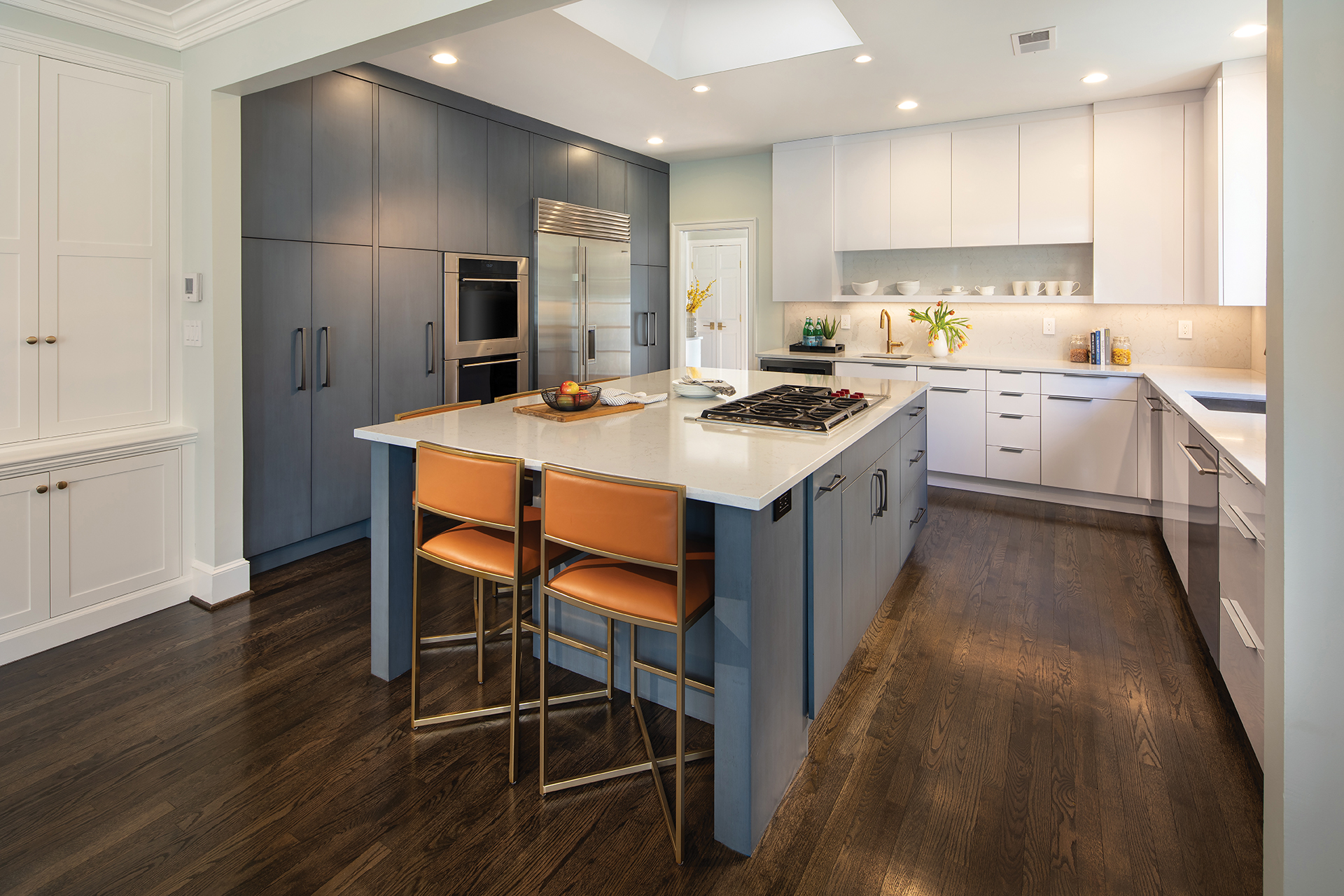 A palette of cool contemporary tones, featuring off-white and pale gray, is offset by saturated colors typically associated with a traditional style. The light tones of the perimeter cabinets are high-gloss, while the island and accent wall have a low-sheen finish. Mixed metals, including gold-toned faucets, charcoal gray drawer pulls on the island, polished chrome tab pulls on the perimeter cabinets and stainless-steel appliances, bring visual interest.