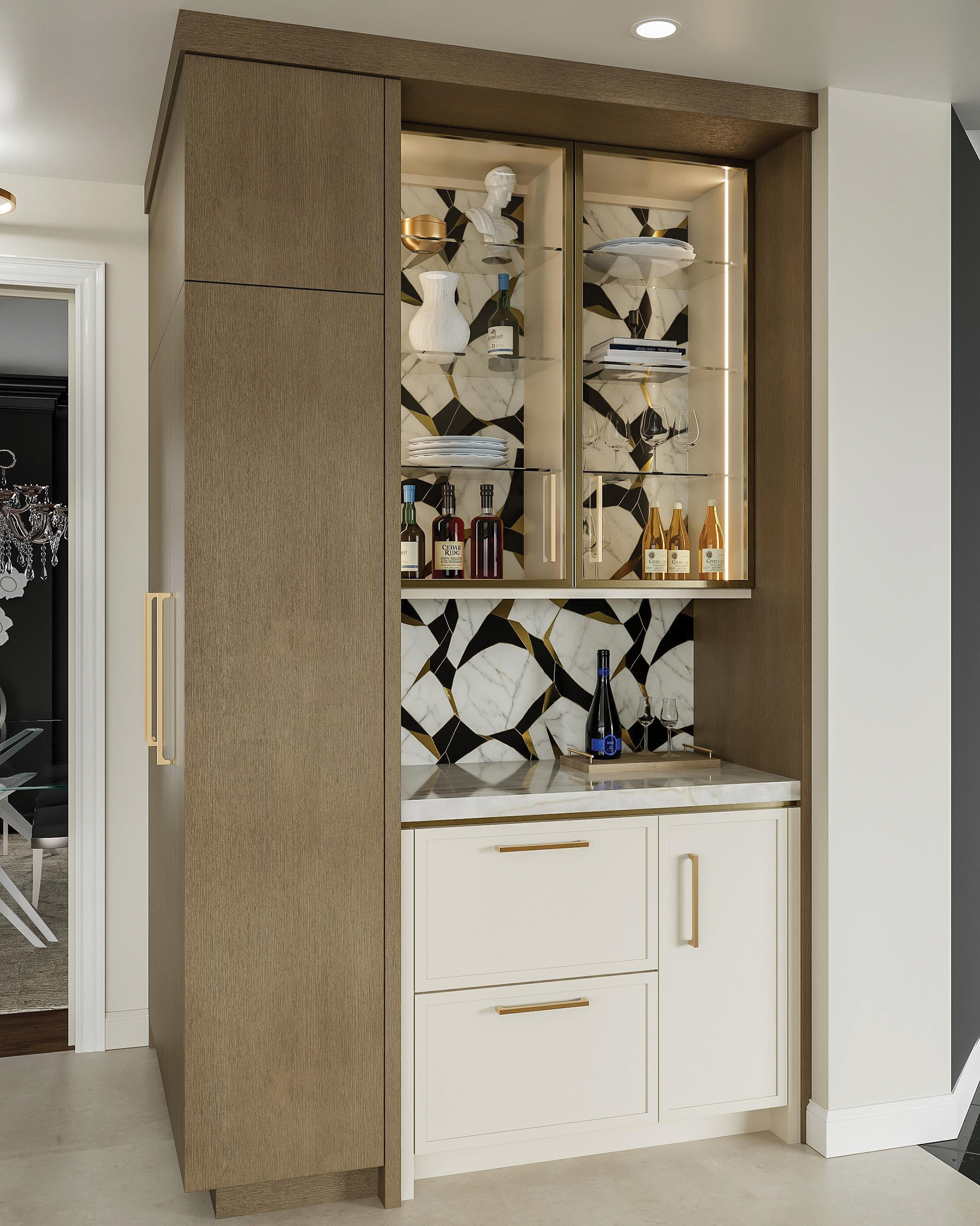 A sophisticated modern kitchen was exactly what clients had in mind when they called upon Lobkovich for a renovation to their Clifton, Virginia, home. Their existing cook space was outdated and busy with raised panel cabinets and oversized square tiles on the floor. Functionally, the wife desired multiple culinary zones. In addition to the primary cooking area, she wished for a new scullery/prep kitchen. This was incorporated by bumping out the existing garage; a new bar for entertaining was created by stealing square footage from under the stairs.
