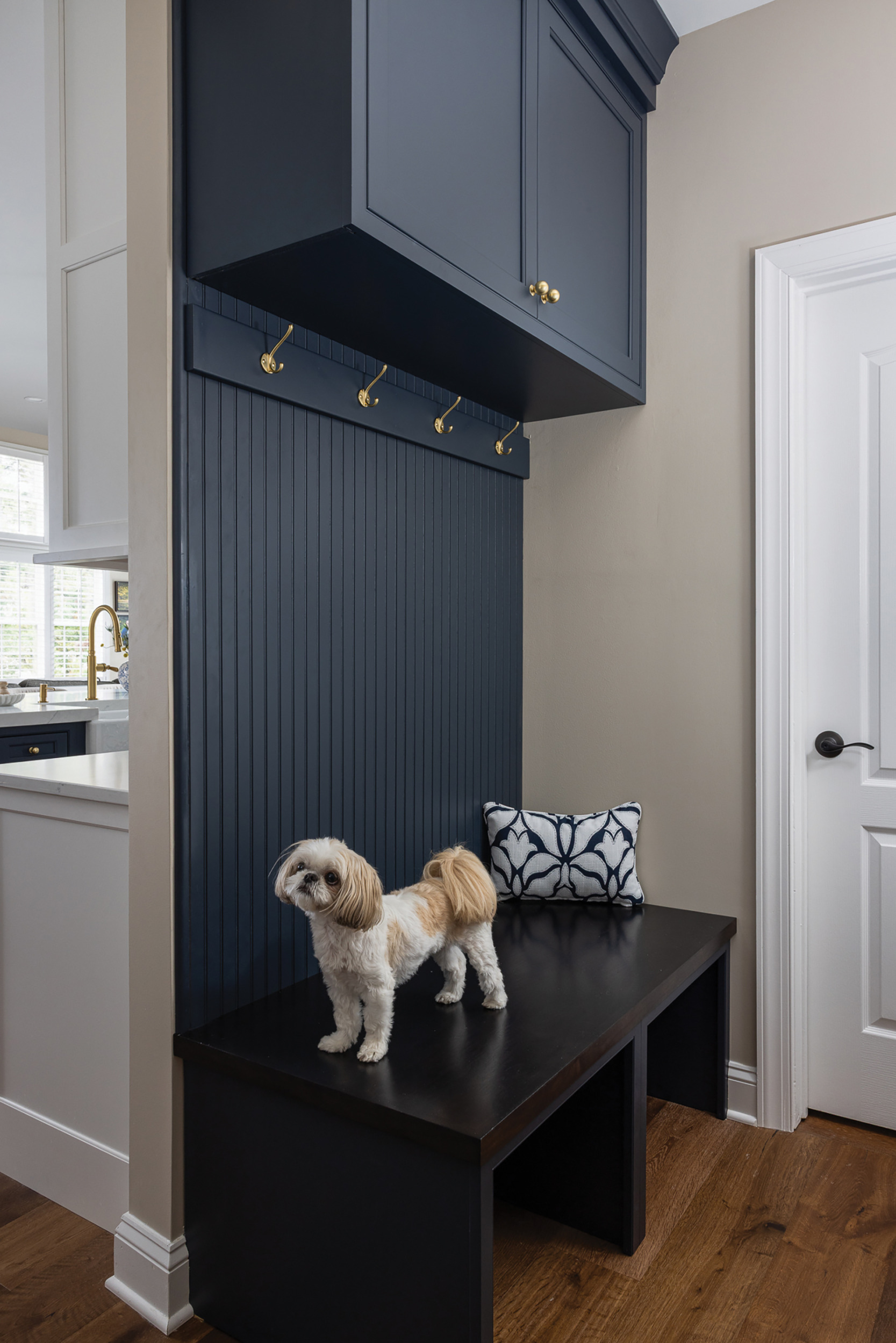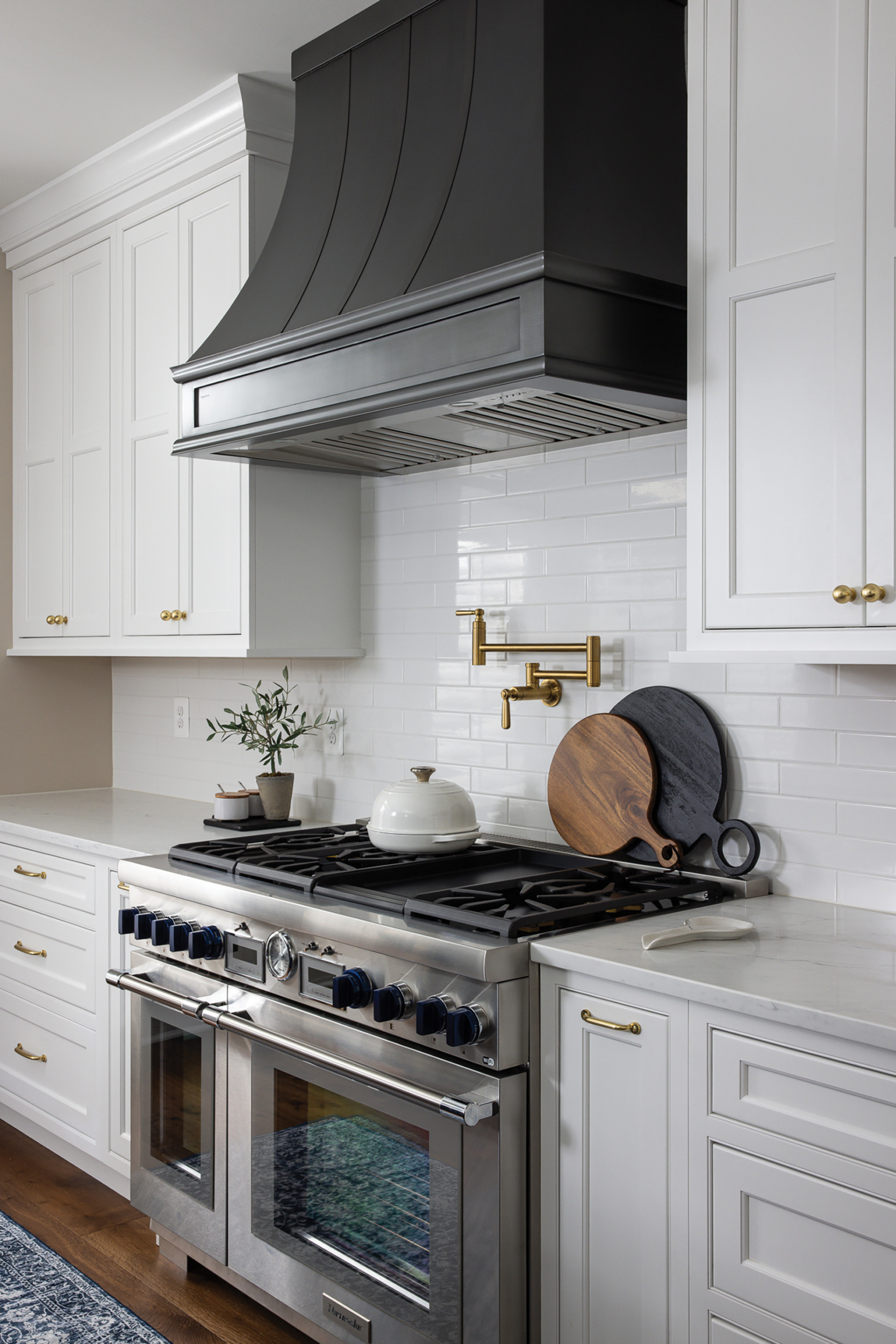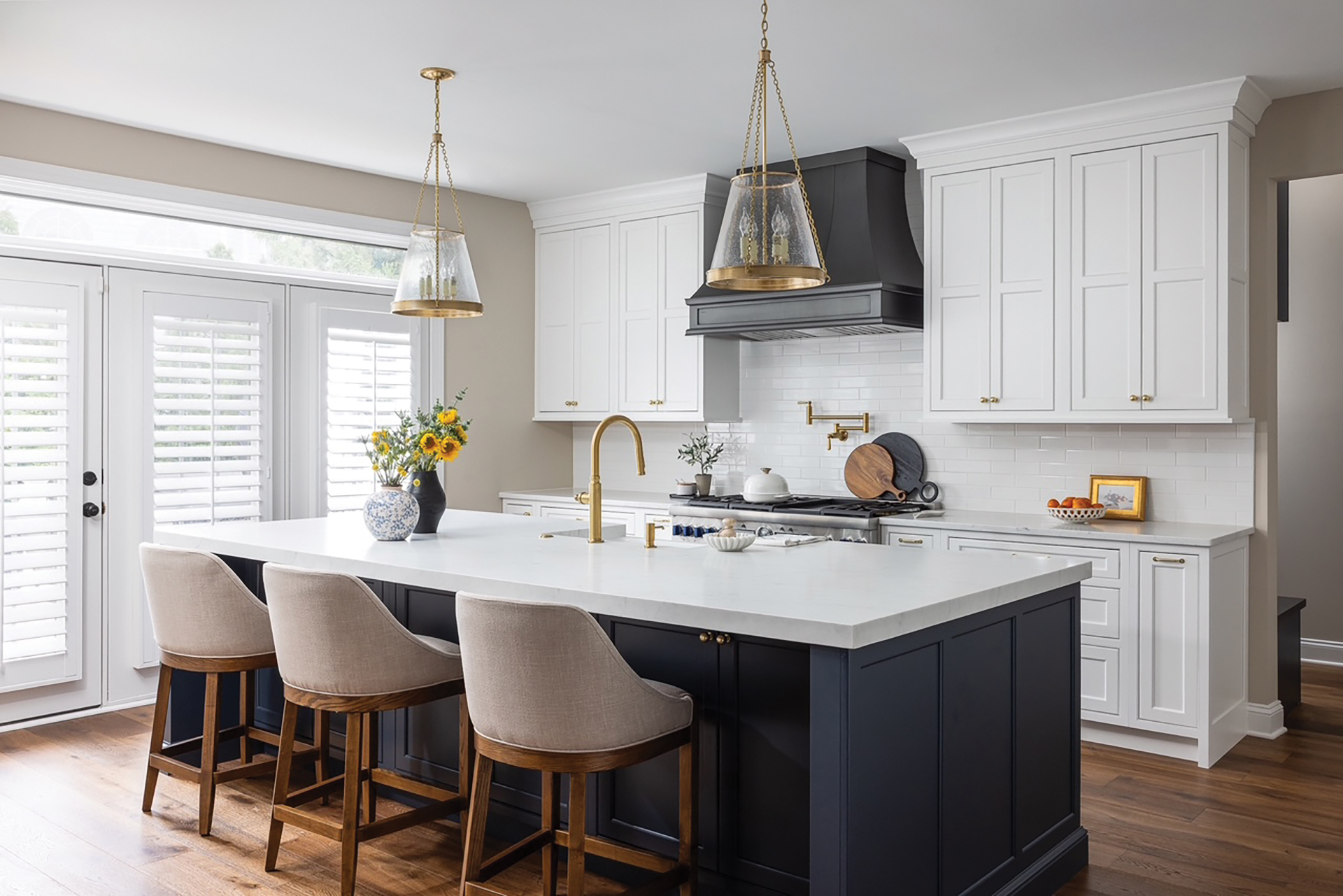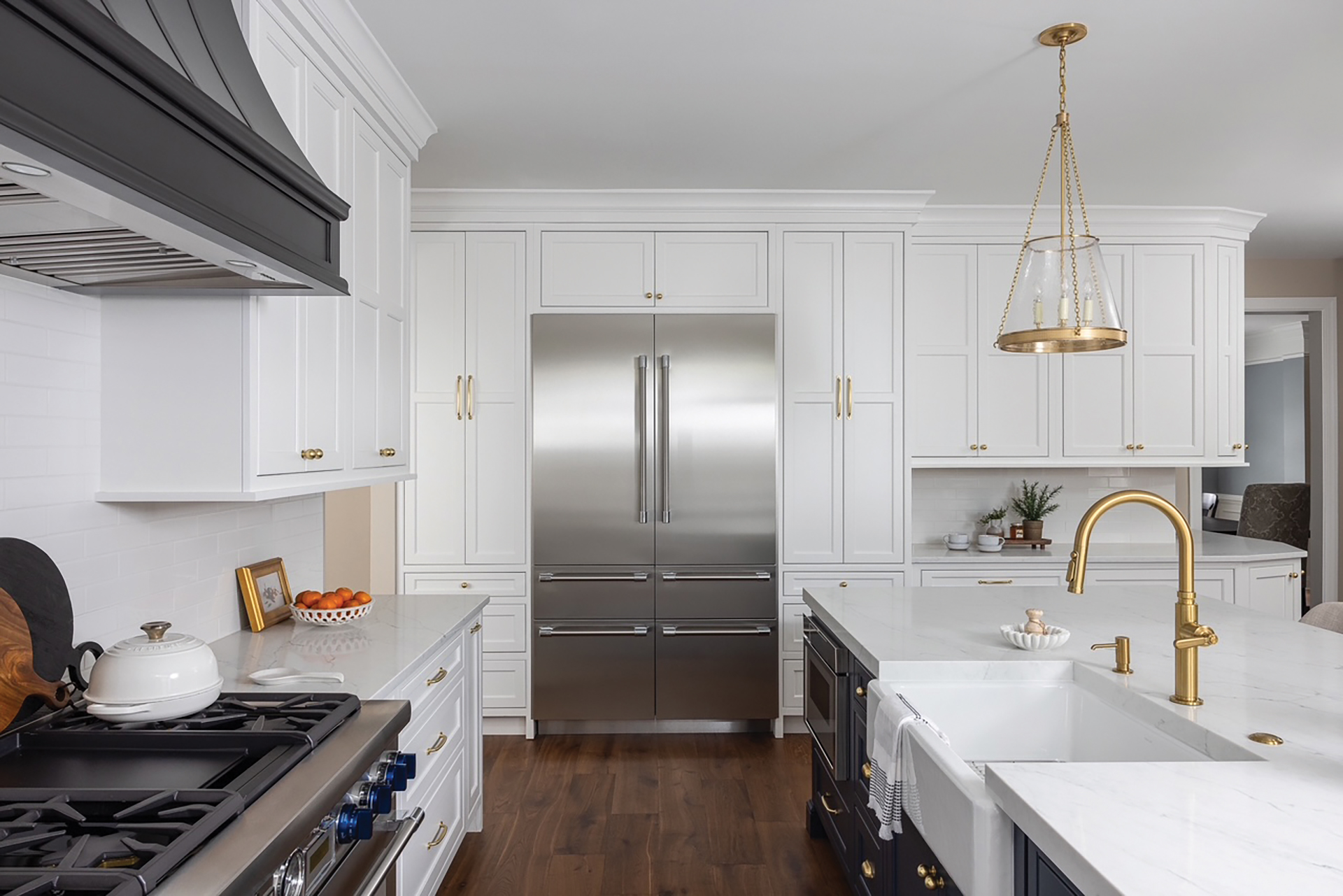 A transitional luxury aesthetic blends classic elegance with modern sophistication. Standout features include Crestwood custom beaded inset cabinets with Emerstone Quartz countertops, Thermador appliances and a custom CopperSmith range hood, while Visual Comfort glass pendants. crown the deep blue island.