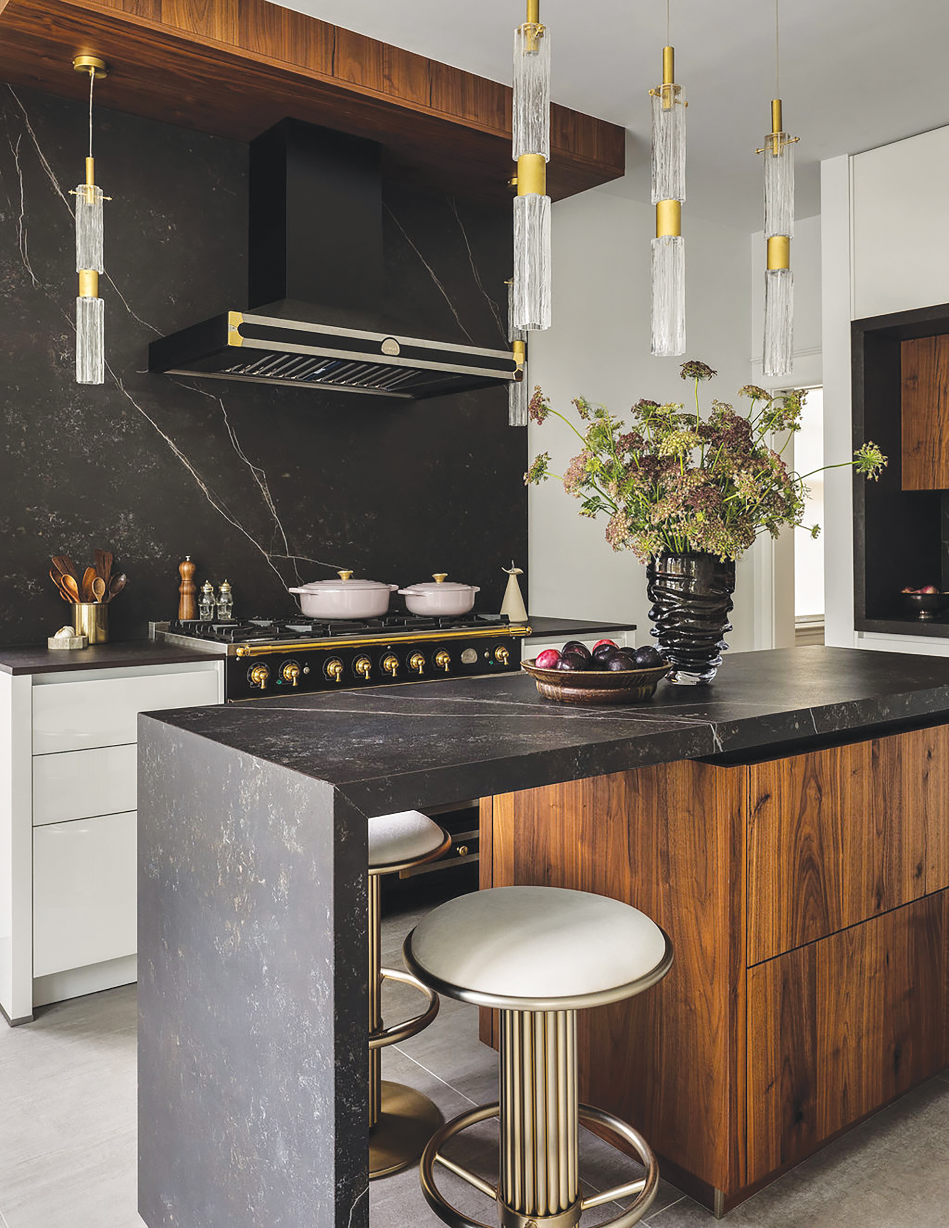Dark Magic “Burgundy, plum and beautifully saturated, blackened colors are gaining real momentum,” states Catherine B. de la Sablonnière, creative director of Ateliers Jacob. “We’re slowly welcoming back deeper color registers, both in stains and in lacquer. Homeowners are embracing warmer woods and medium-to-dark browns, along with rich lacquer tones,” as shown in an Ateliers Jacob kitchen with dark-brown wood cabinets and Fantasy Brown quartzite surfaces.