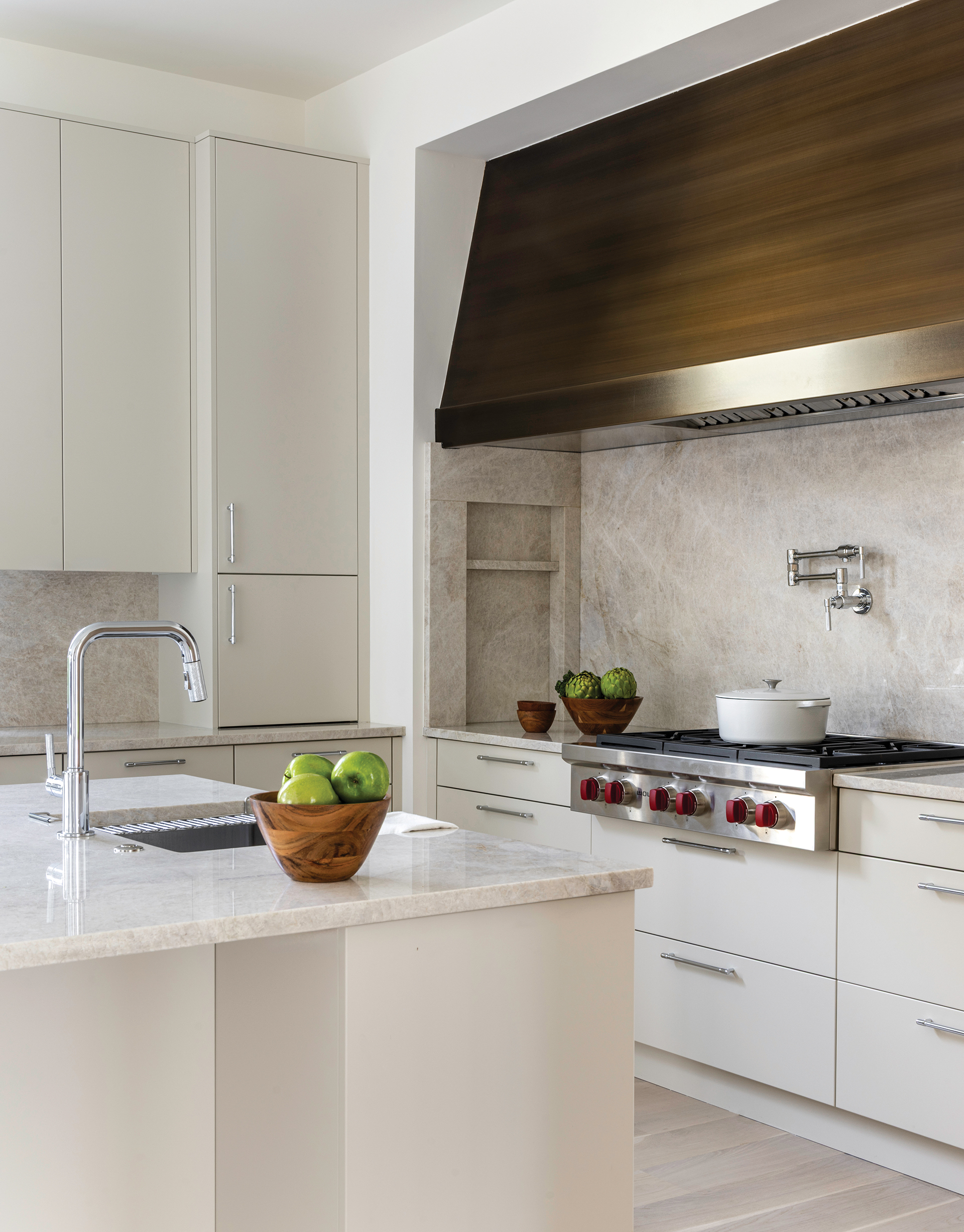 Stone Age “Clients are embracing more natural stone,” says Stephanie Fried of Jack Rosen Custom Kitchens. “And wide, statement hoods create a dramatic focal point.”