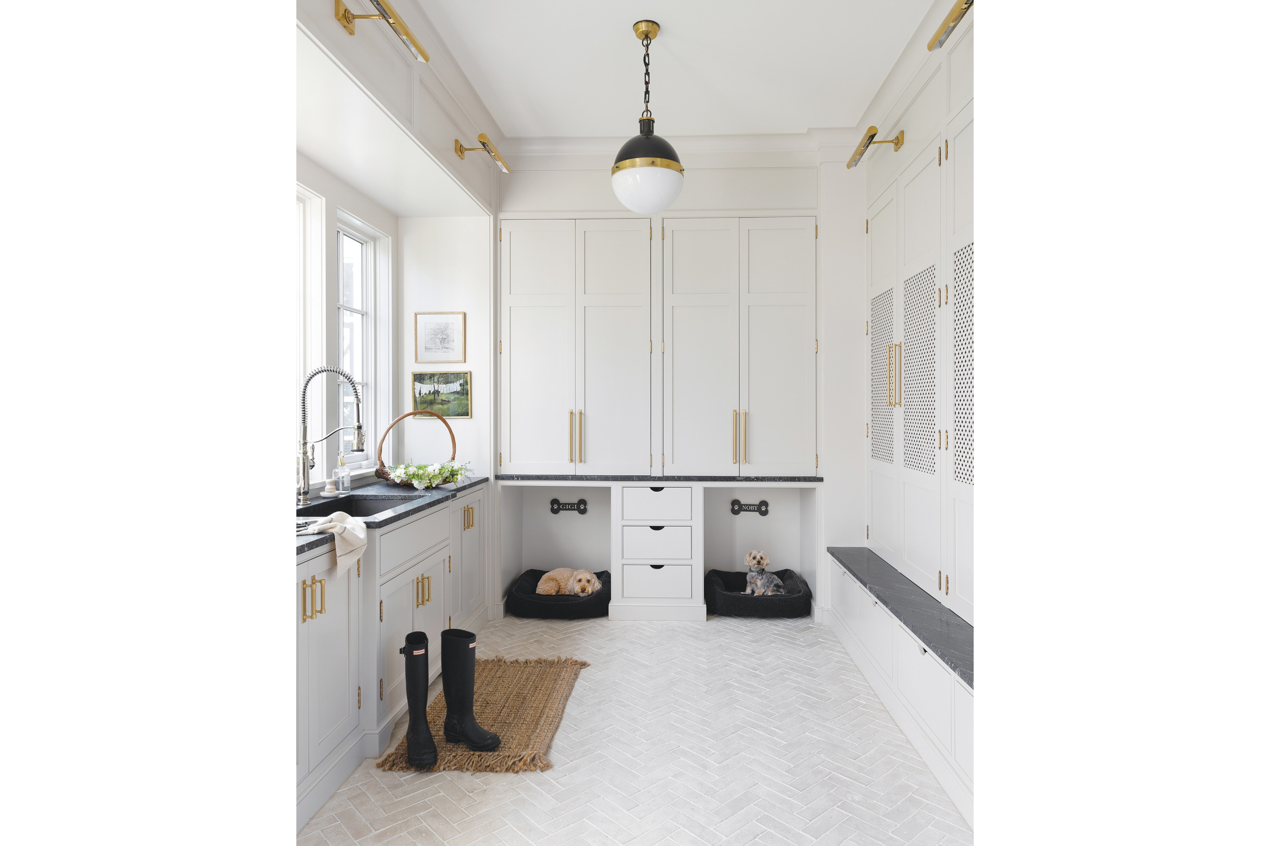 Empty nesters with a blended family in Easton, Maryland, needed a mudroom that would stand up to the wear and tear of dogs and company. “The clients travel through this room each time they enter or leave their home, so we aimed to make it a calming, but durable space,” says designer Laura Butler of Butler Interior Design, who worked on the new build with Focus Construction. Arto brick veneer flooring, laid in a herringbone pattern, provides a base for cabinetry with dark granite counters and breathable lattice on the cubby doors. Built-in niches house dog beds and brass mesh gates contain pups to the utility area. All in all, it’s a high-functioning spot for foot traffic from people and little paws alike.