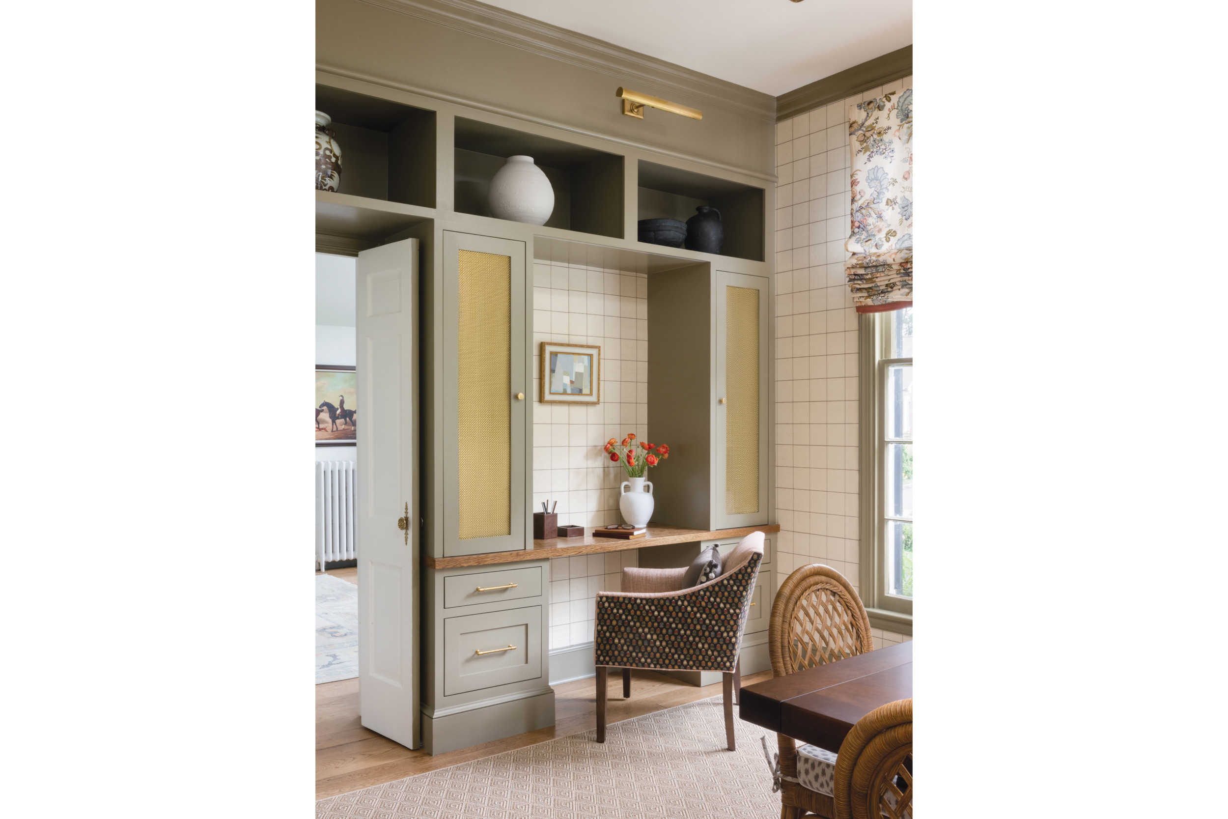 A young family of six in Arlington needed to pack a ton of function into this flex space, which is used for homework, casual dining and arts-and-crafts. Designer Suzanne Carlough of Carlough & Co. “incorporated hidden storage as well as a desk for working from home.” A wall of built-ins conceals lower drawers for files and stationery, while upper cabinets with brass wire-mesh doors hold art supplies and board games. Up top, open display shelves show off pottery and decorative objets. The cabinetry and trim are painted a soft sage green, and the walls sport a windowpane grasscloth from Schumacher that lends the space a timeless, tailored look.