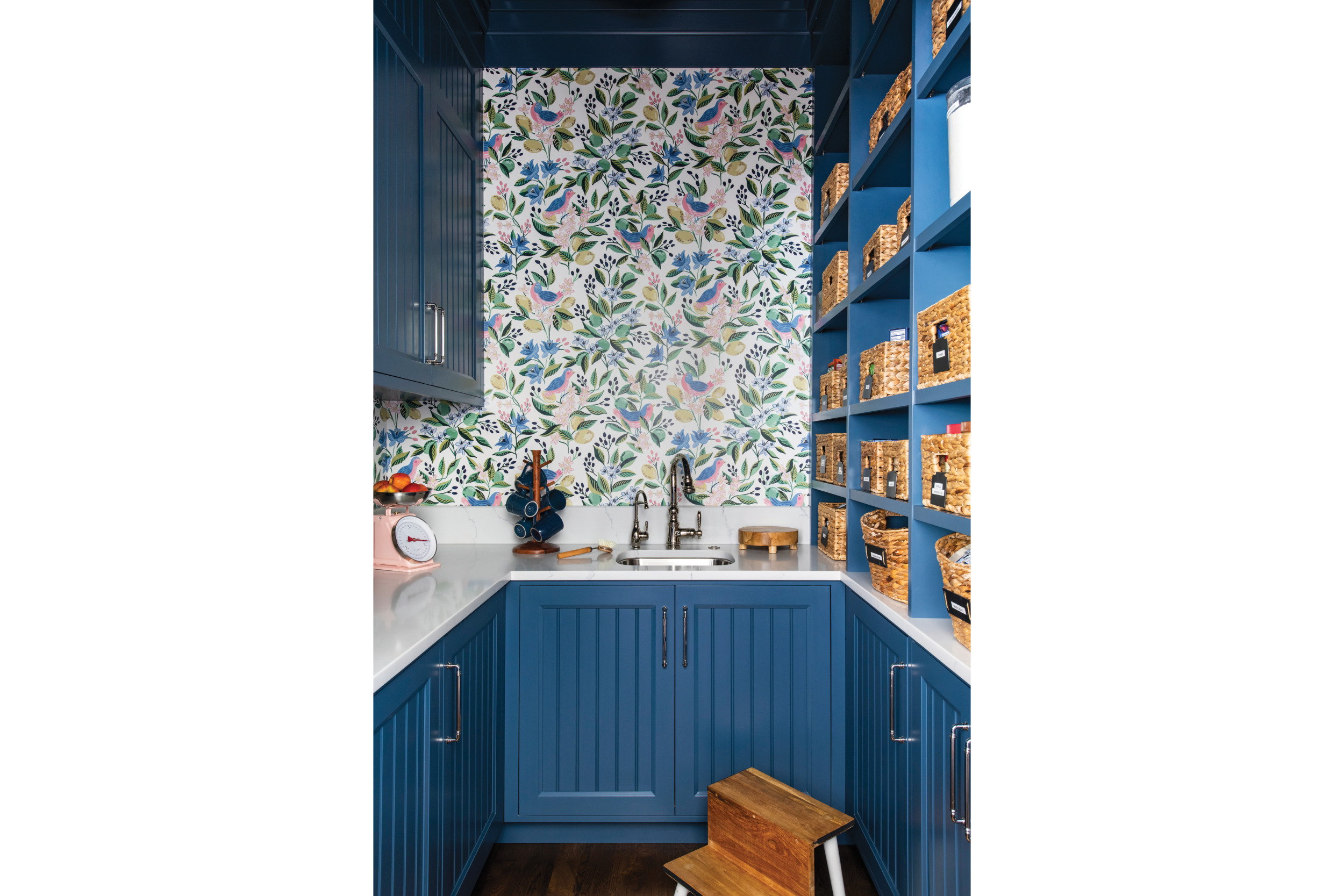Interior designer Lauren Hurlbrink had a blast designing this small but mighty butler’s pantry for a couple with four pre-teen kids in Owings Mills, Maryland. Open shelving holds labeled baskets that corral snacks and other staples, while the microwave and coffee machine are discretely tucked away. “As a designer, I love having stuff like small appliances out of sight,” she shares. A colorful bird-print Caitlin Wilson wallpaper and cabinetry painted Farrow & Ball’s Stiffkey Blue convey a joyful vibe. Says Hurlbrink, “It used to be that the powder room was the place we had fun designing, but these days the pantry has become the new powder room.”