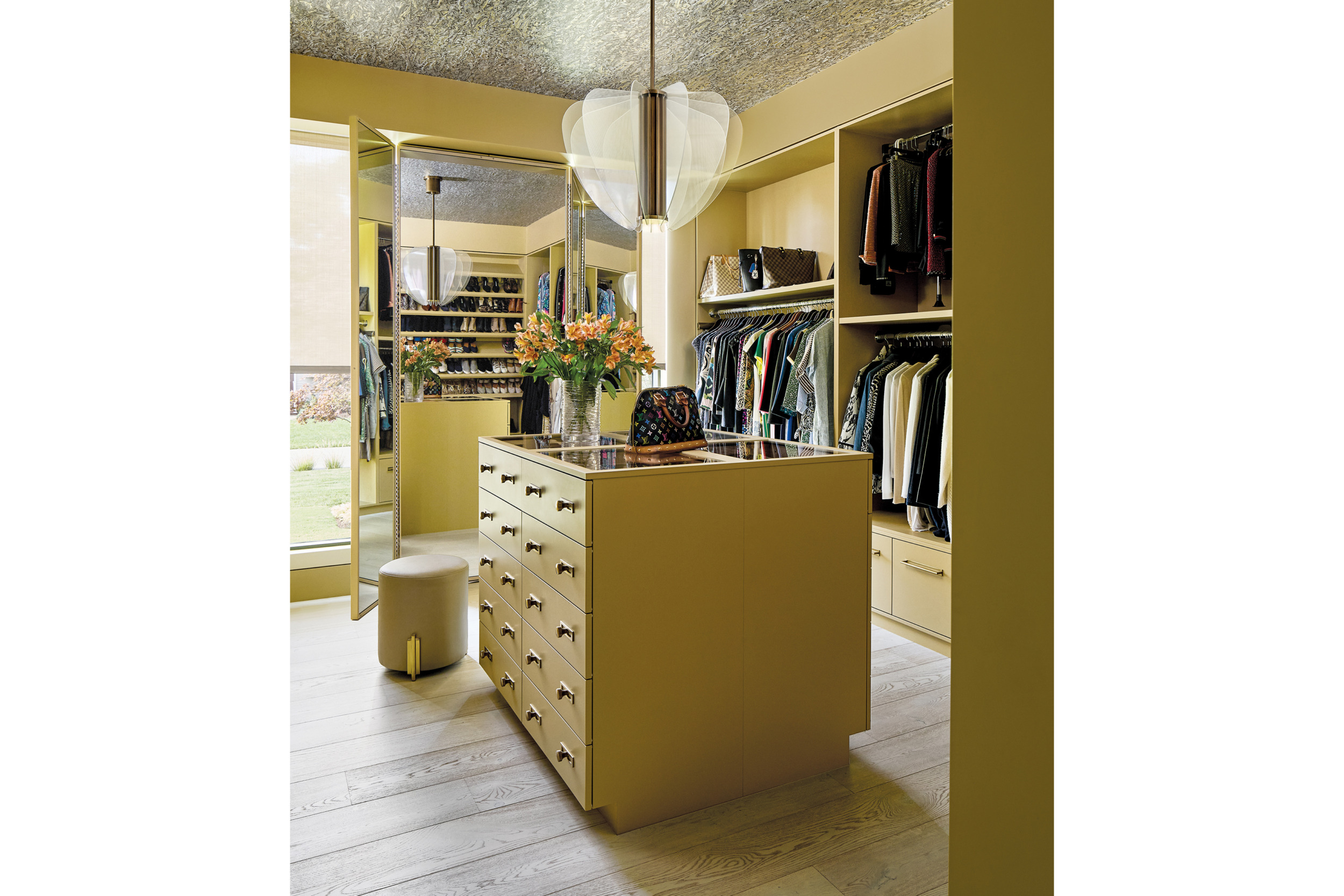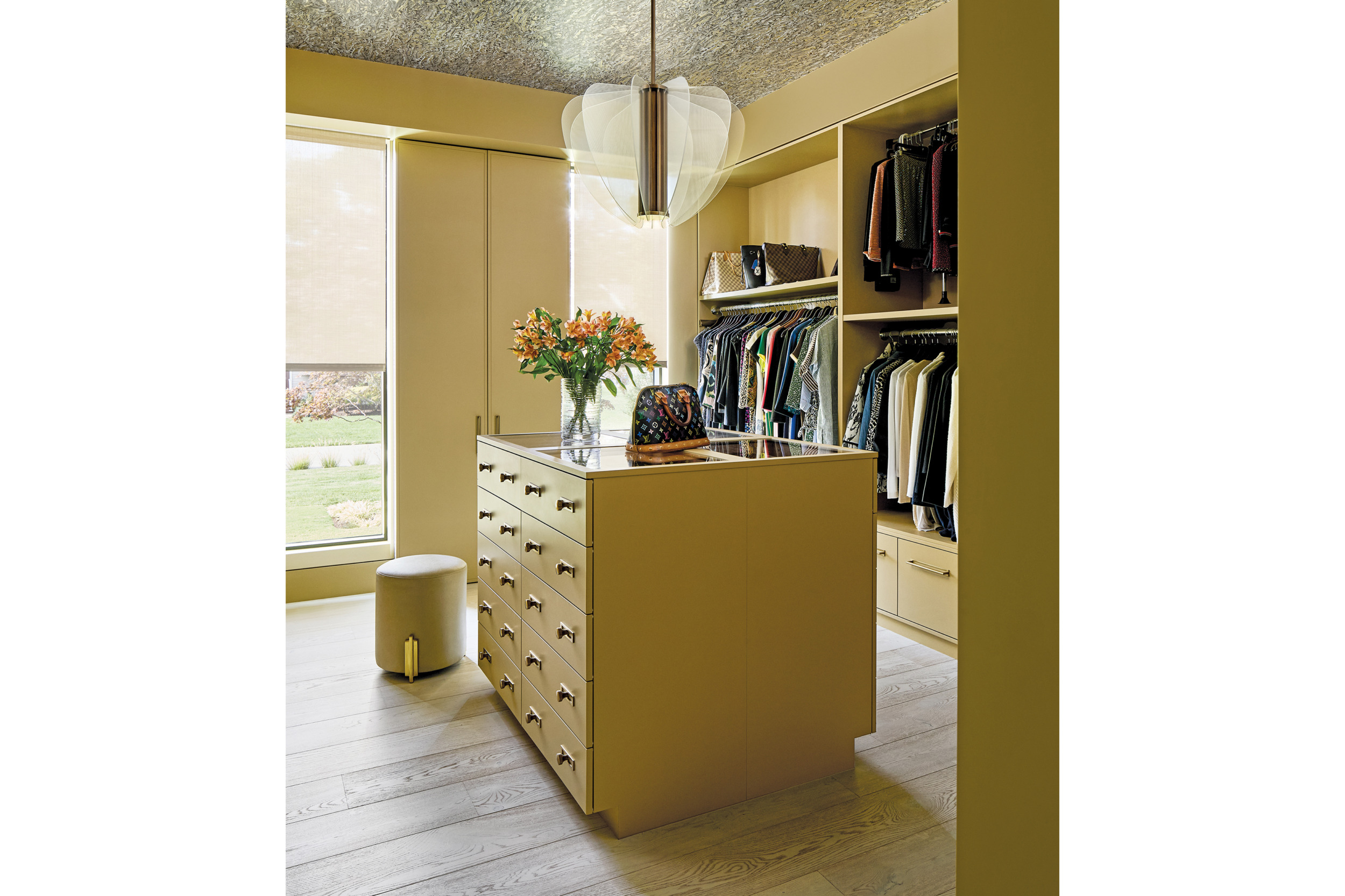 For a newlywed couple in Annapolis, ample closets solved a myriad of storage issues, especially for the wife. “She loves to color-coordinate her glasses with her outfits, so having a place where she could easily see her eyewear collection was a must,” relays interior designer Katalin Farnady of Farnady Interiors, who worked on the project with architect Peter Miles of The Drawing Board. A large, central island contains space for spectacles and jewelry, while pull-down bars for hanging clothes make the most of the 10-foot ceilings. The dressing room’s cheery hue coordinates with the adjacent primary bath and Winfield Thybony wallpaper on the ceiling provides the perfect complement to his closet, which is gray.