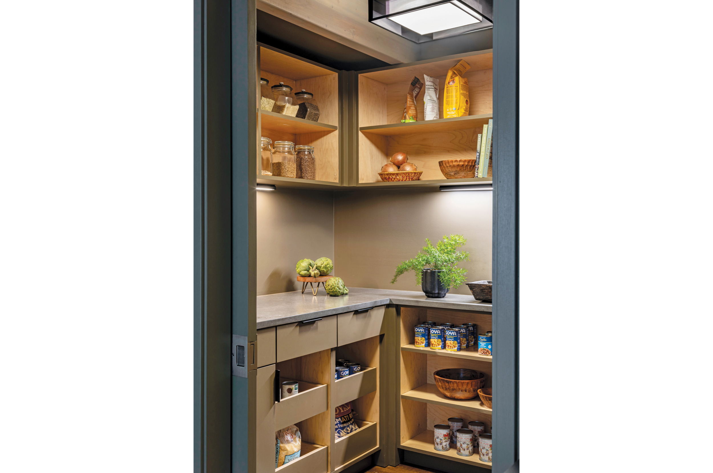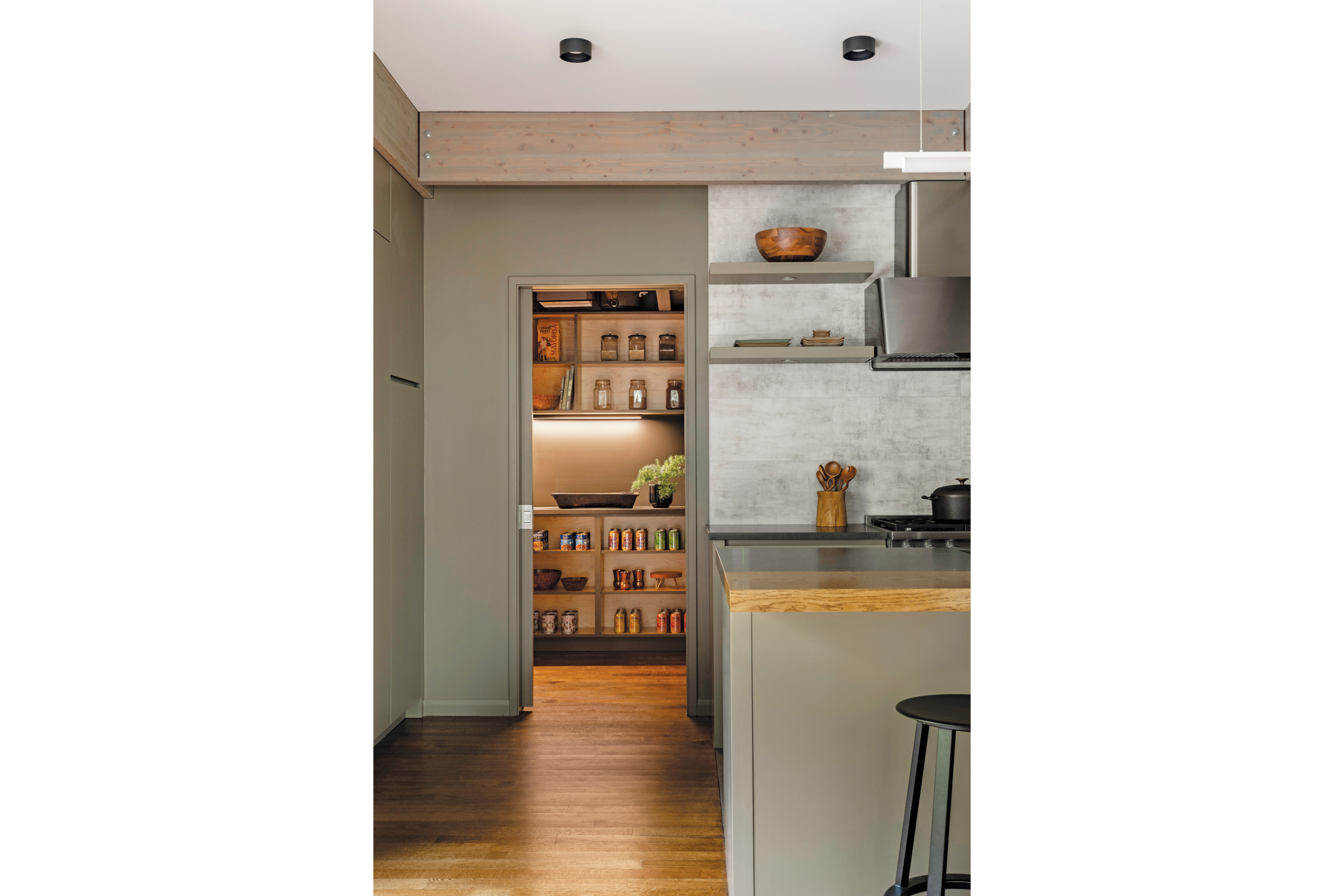 Rill Architects had renovated this midcentury modern home in Chevy Chase, Maryland, prior to tackling the kitchen and pantry, so the clients had time to think about their non-negotiables. Desiring an entertaining-ready kitchen meant needing a place to keep everything out of sight. Behind the walk-in pantry’s pocket door, custom maple cabinetry, painted Farrow & Ball’s Salon Drab, hides everything from dry goods to blenders and crockpots. Honed Reliance Bellini Quartz countertops lit by under-cabinet lights offer extra prep space. “There are almost as many functional needs for the pantry as there are for the kitchen,” says architect Jim Rill. “Then of course, you want to make it pretty, too.”