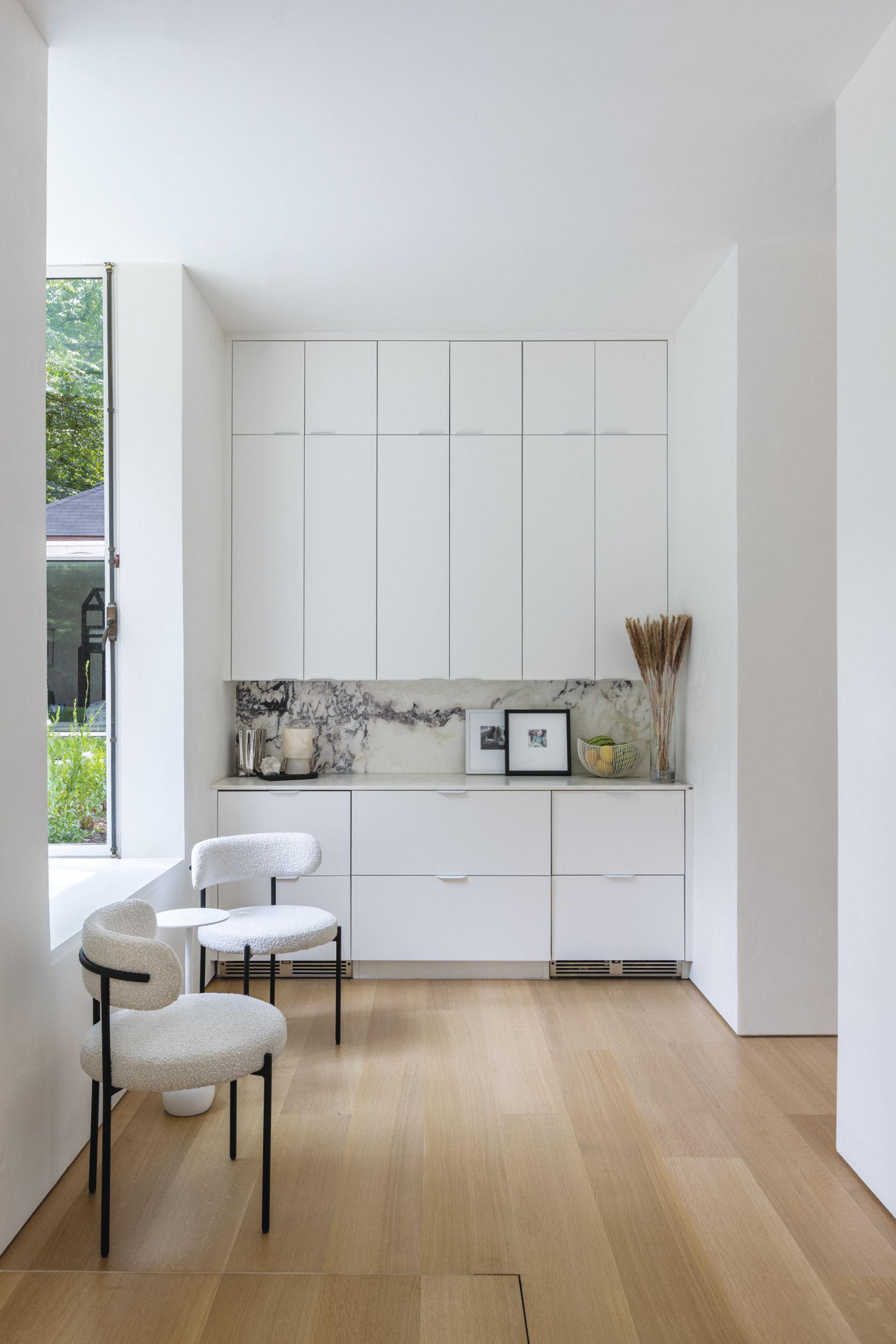 Countertop/Backsplash: marblesystems.com. Brass Sink Faucet: weaverhardware.com. Pull-Down Kitchen Faucet: calfaucets.com. Microwave: mieleusa.com through abwappliances.com. Oven & Induction Cooktop: Thermador.com through abwappliances.com. Fridge: subzero-wolf.com through abwappliances.com. Custom Cabinet Design: stclairkitchens.com. Custom Cabinet Fabrication: christianacabinetry.com. Cabinetry Paint Color: Chantilly Lace by benjaminmoore.com. Chairs: allmodern.com. Custom Concrete Dining Table & Benches: Design by Courtney Parrie; Marble Concrete Fabrication: BHS Construction. Side Dining Chairs: crateandbarrel.com. Children’s Chairs: rhbabyandchild.rh.com.