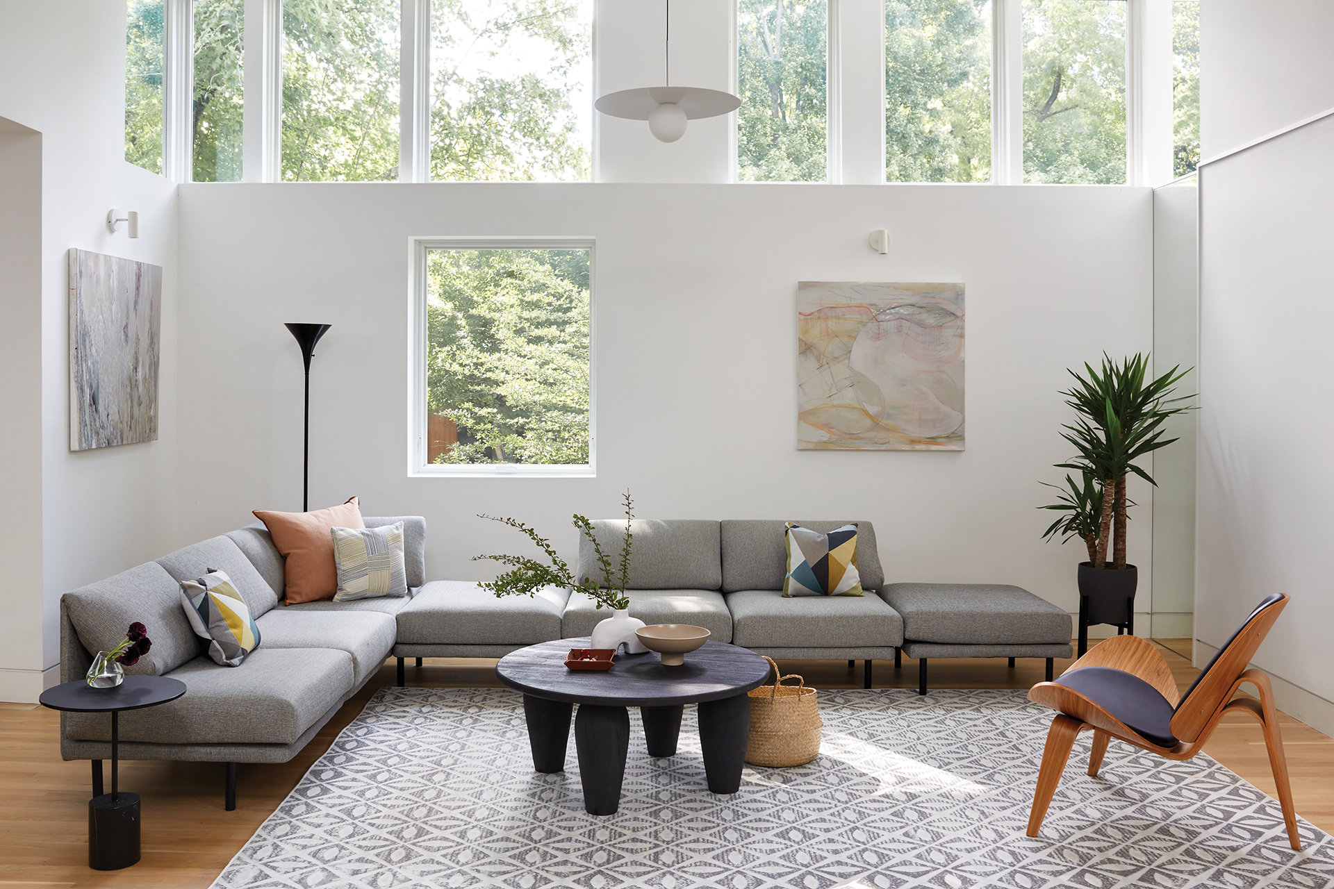 A modular Burrow sofa and Hans Wegner Shell chair face a Four Hands coffee table in the reimagined living area.