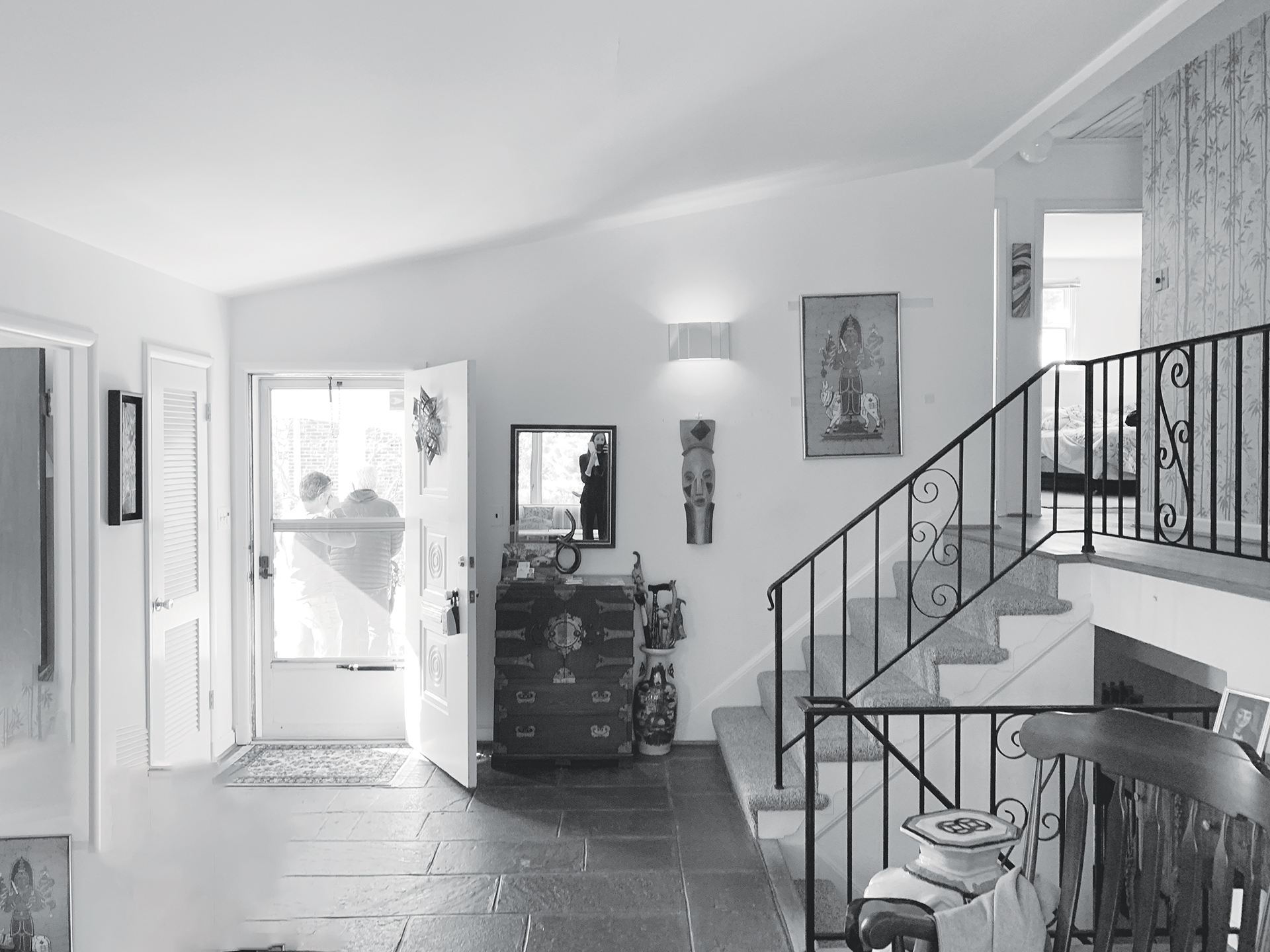 Originally, the main entrance was located on the side of the house, accessed from the carport. Healey shifted it to the front, where she was able to create “a real front entry,” she says. Now, visitors enjoy a direct sightline up the original split level staircase to a seating nook with a picture-window view of the wooded backyard. The nook, she points out, “feels like it’s part of the public portion of the house, but it actually belongs to the primary suite.” It can be closed off by a wide pocket door.