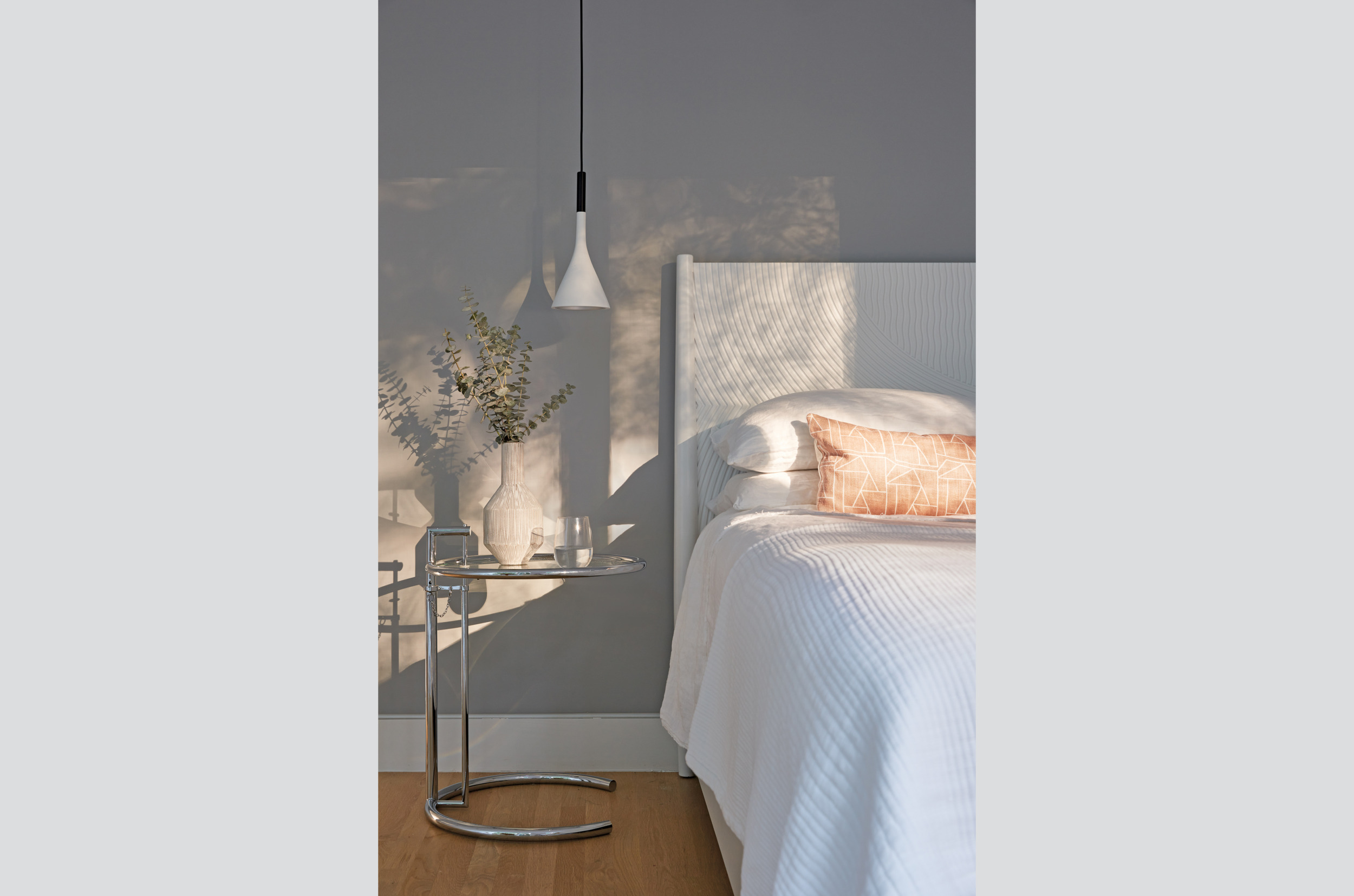 In the primary suite, a Foscarini pendant hangs over an Eileen Gray night table.