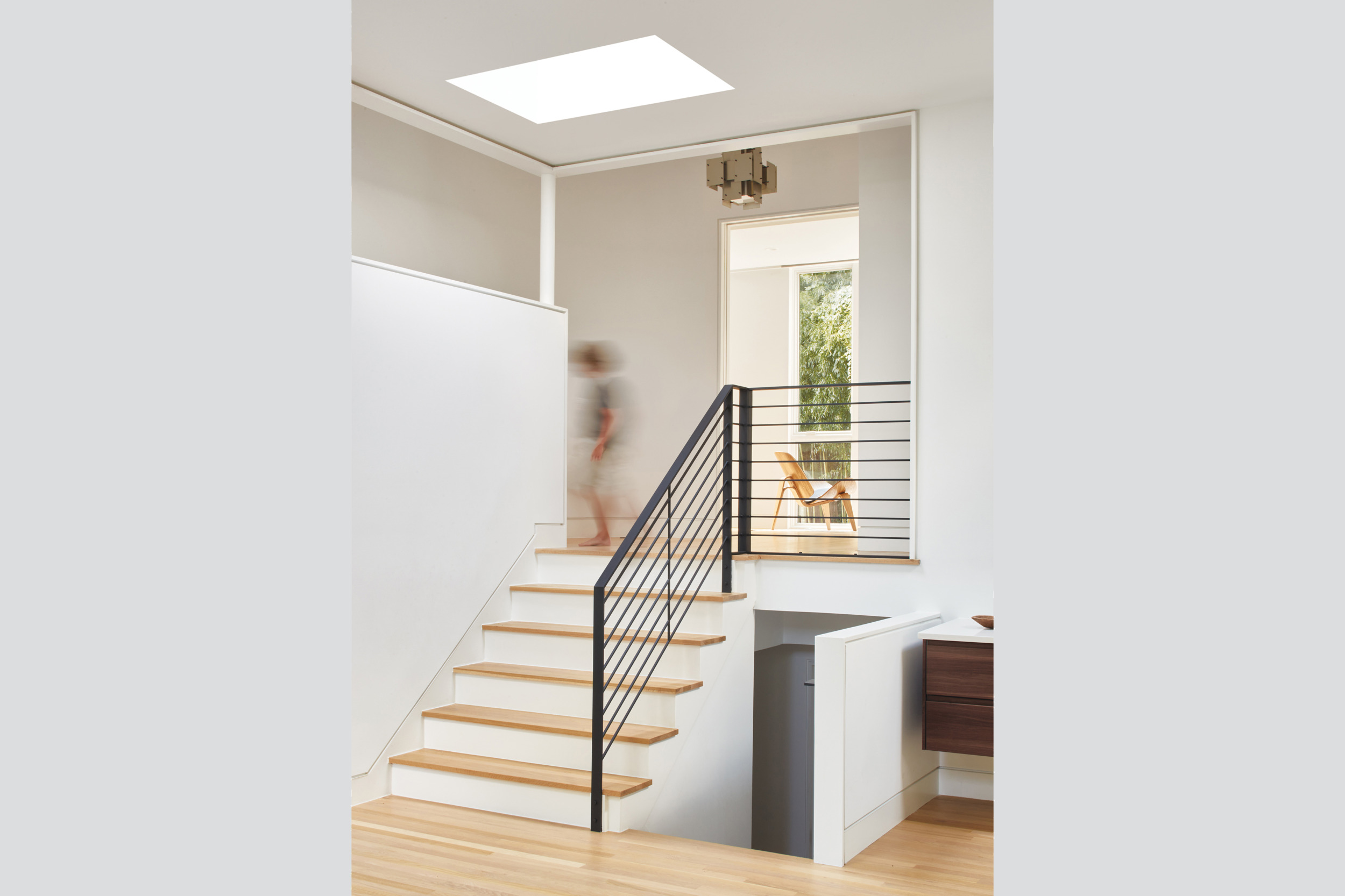 The existing split-level staircase got an upgrade with new white oak treads and a streamlined iron railing.