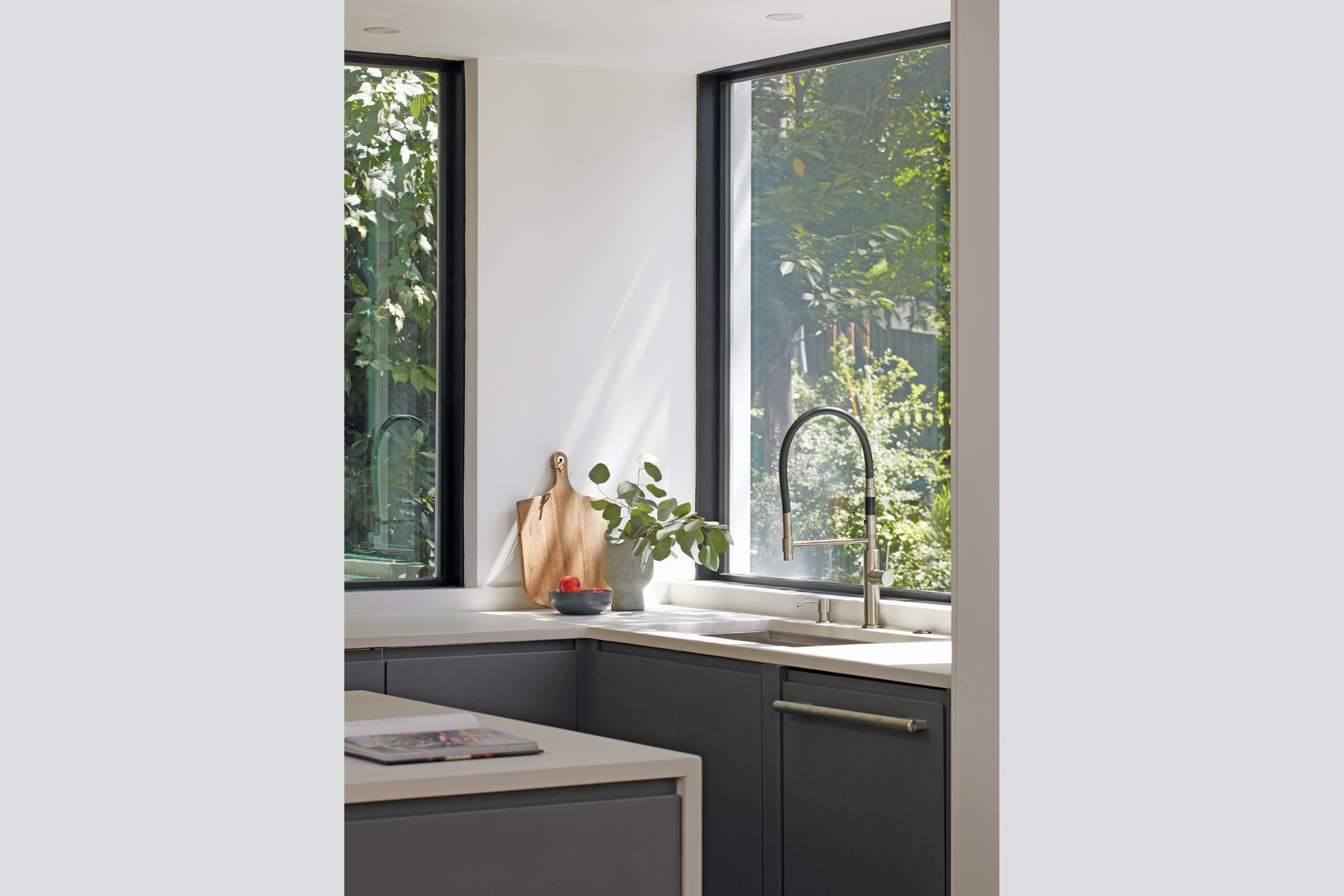 The kitchen eschews upper cabinetry in favor of expansive windows.