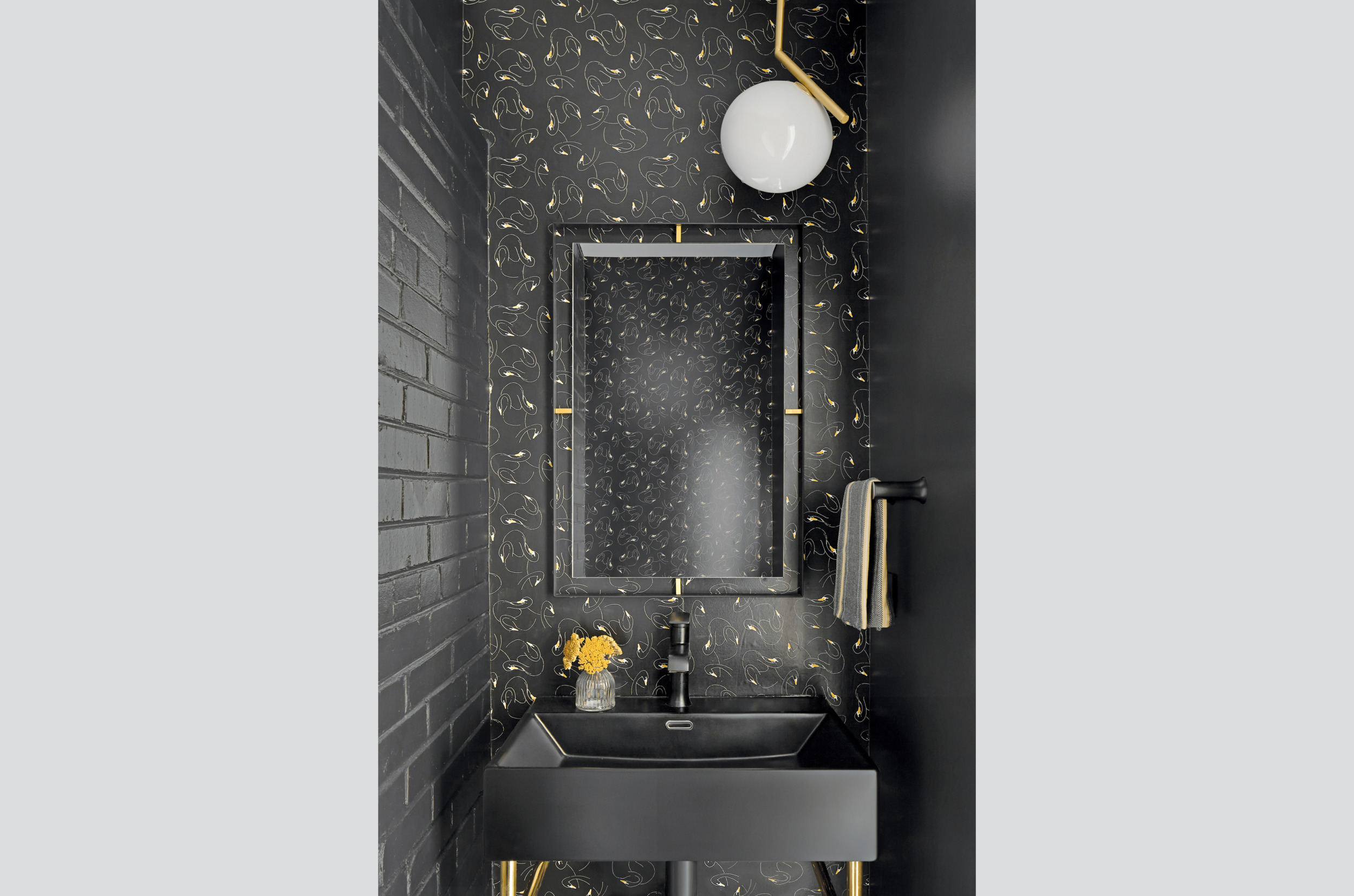 Chic, black-stained brick and Kate Zaremba wallpaper elevate the diminutive powder room.