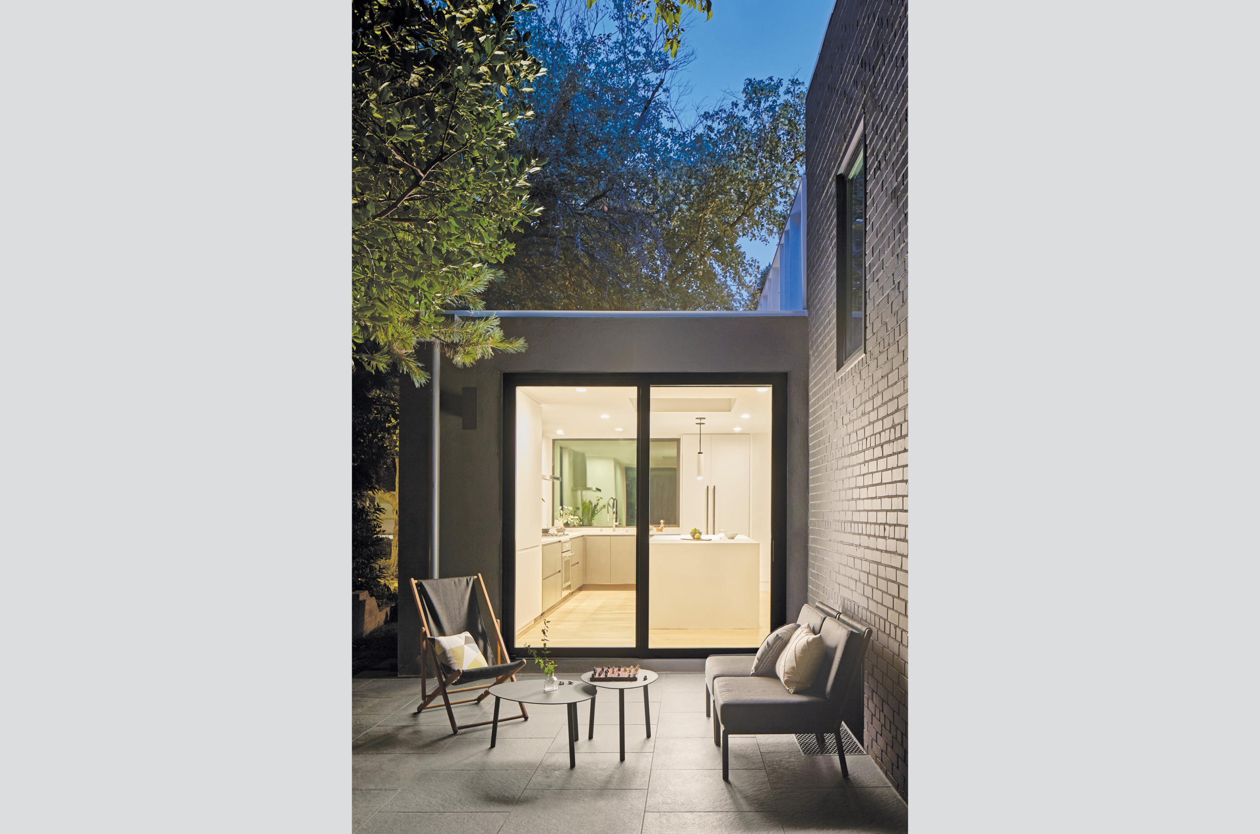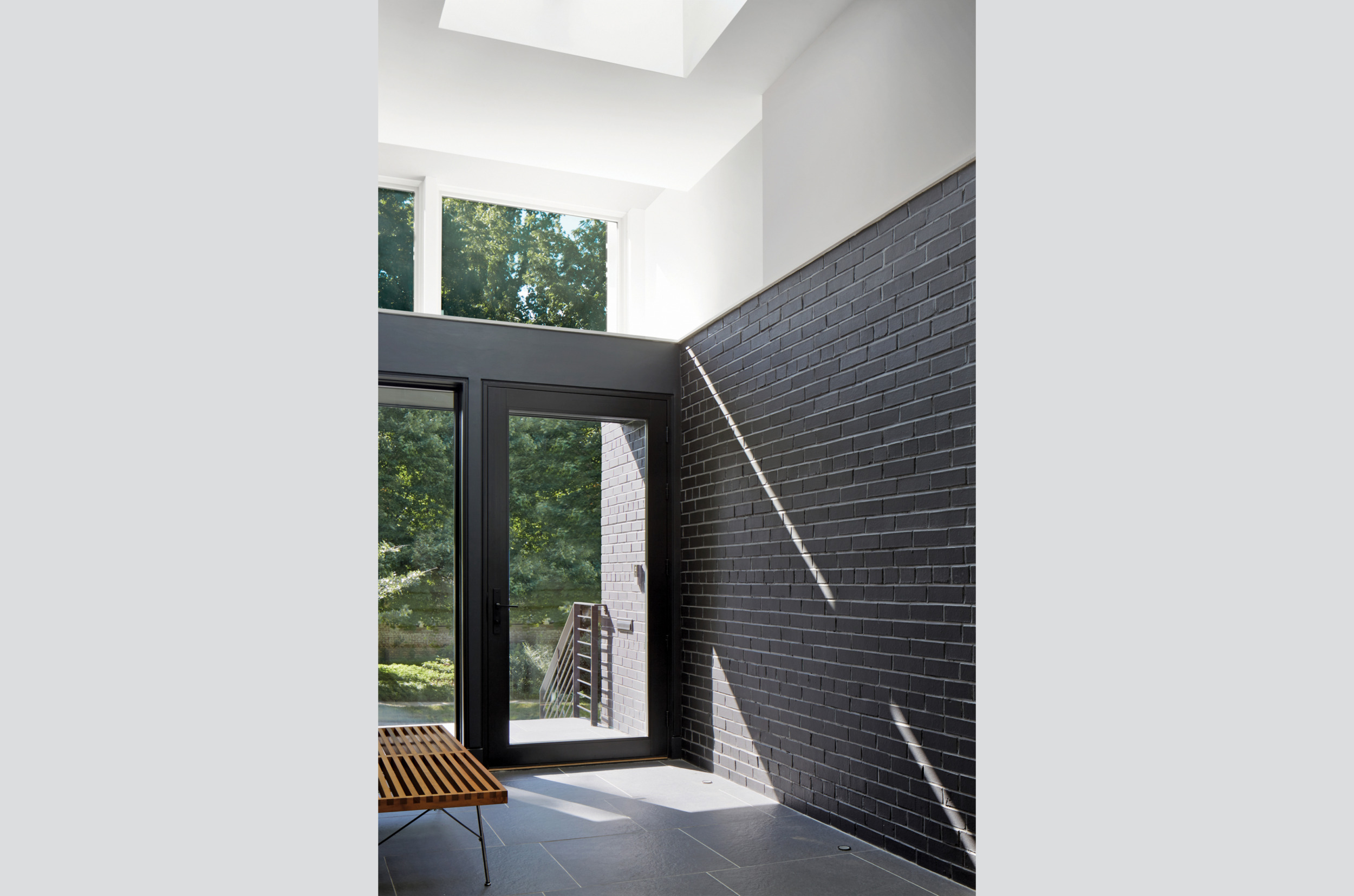 Healey also took on the challenge of elevating the home’s mid-century profile. The front entrance now heralds its provenance with surfaces that crop up inside and out—a common feature of the era. Black-stained brick walls, some original, continue outdoors, while slate-look porcelain grounds both the entry hall floor and front stoop. Subtle reveals on baseboards and trim are a modern touch.