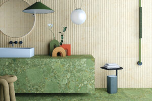 A modern aesthetic prevails. Sleek, European-style cabinetry is distinguished by a ribbed surface. Dark-stained wood and green accents in marble and tile connect the kitchen to the woodsy tableau visible just outside the window.