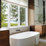 Clients with an Eastern Shore getaway on the Wye River wanted a whole-house update that would better reflect their mid-century sensibilities. Tapped for the job, architect Colleen Healey reimagined the primary bath with clean lines and crisp detailing. “We used materials like bronze and walnut to create a rich, warm material palette in a contemporary language,” Healey observes.