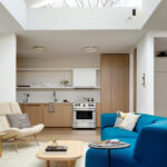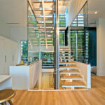 A floating staircase anchored by panels of perforated stainless steel and glass also bounces light throughout the interiors. From the open living, dining and kitchen area, the stair leads to a second level housing two ensuite bedrooms, plus a primary suite on the third floor. A lower level accommodates a separate apartment.