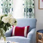 Sutter brought in shades of blue throughout—from the crisp-white kitchen with its light-blue accents to the powder room with textured, tile-look wallpaper. Blue saturates the walls of the cozy library (pictured), where upholstered seating beckons.
