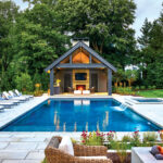 | While the surrounding pastureland was beautiful, there were no plantings or hardscape areas on the property to enhance the immediate views—or the owners’ outdoor lifestyle. | A full-range Pennsylvania bluestone patio accommodates poolside dining and lounging. A Carderock stone seat wall holds a profusion of flowers, including hydrangea, hibiscus, coneflowers, Knockout roses and butterfly bushes. |