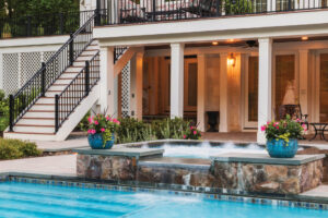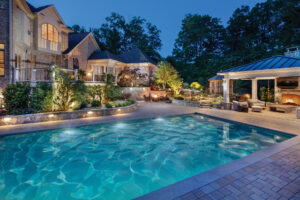 Homeowners on a wooded lot in McLean enlisted landscape architect Oomer Syed of Fine Landscapes to reimagine their mundane backyard as a vibrant outdoor entertainment zone. “Our design encapsulates all the elements of fine outdoor living. An open-air structure is equipped for cooking, lounging and dining, with a changing room/bath,” recounts Syed. “And, of course, there’s the pool and spa.”