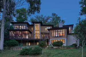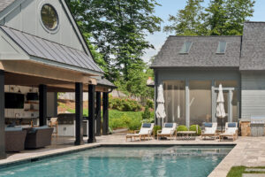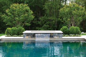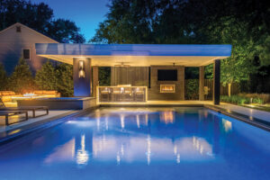 Tapped to create a poolscape on a narrow McLean property, Pristine Acres conceived a compact design incorporating a flat-roof pavilion housing a waterfall edge bar, linear fireplace and grilling station; a 20-by-40-foot swimming pool and adjacent hot tub; a fire pit; and space for backyard recreation—all while preserving mature trees on the lot.