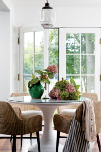 The design team collaborated with an architect on the two-level cabana, which encompasses an open seating area around a stone fireplace flanked by built-ins; curtains soften the openings to the structure. There’s a bathroom on the ground level and guest bedrooms above, accessible via an outdoor stair. A Pennsylvania bluestone floor continues out to the pool, unifying sheltered and open spaces. Beyond the pool, an expanse of lawn stretches down to the river where a dock beckons. Mass plantings of shrubs, perennials and grasses provide year-round color and textural interest.