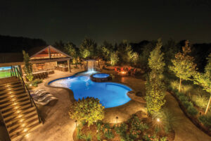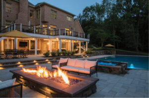 Masterminded by Pristine Acres, a three-acre property in Leesburg, Virginia, became a destination for homeowners who love the outdoors and wanted to be able to enjoy their yard year-round. The plan centered on a freeform swimming pool and custom waterfall with a natural boulder surround. Elements that address cool-weather needs include a pavilion equipped with a fireplace and kitchen; a natural-boulder fire pit; and a covered golf simulator. Beneath the deck, a sauna beckons, with a cold plunge for heat and cooling therapy.