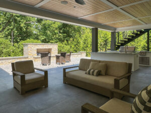 Homeowners in McLean tasked McHale with an overhaul that would create outdoor living spaces suitable for at least three seasons. The existing deck was upgraded and enlarged, with a portion of it screened; staircases at each end connect to a kitchen and living area installed beneath. An adjacent gas fireplace is a cozy gathering spot for the cooler months.