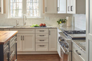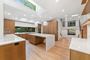 Removing non-loadbearing walls made way for an open-concept plan that integrated the kitchen with the surrounding rooms. Abundant cupboards, ample drawers, a designated coffee station, and surfaces for food prep answered the owners’ functionality needs.