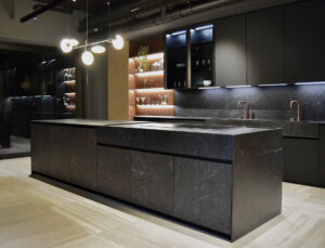 Four cabinetry materials were used, including cream-colored lacquer, wood-look laminate, velvet touch black, and black aluminum. “The mix of materials and cabinet door models is balanced, so it doesn’t challenge the eye but still makes a statement,” Catherine explains. The Calacatta Gold Quartz countertops and backsplash from Silestone tie it all together. Fisher & Paykel and Bosch appliances complete the transformation.