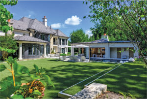 The backyard previously sloped towards the 2015 abode. “We regraded and addressed changes in elevation with stone retaining walls,” Vedrani notes. The pool was sited on a central axis to the house with the lawn to one side; wide, buff limestone steppers lead to the play area. Bordering the pool on the other side, the chic pool house encompasses living and dining areas and a full kitchen; the structure opens up via walls of sliders for indoor-outdoor flow.